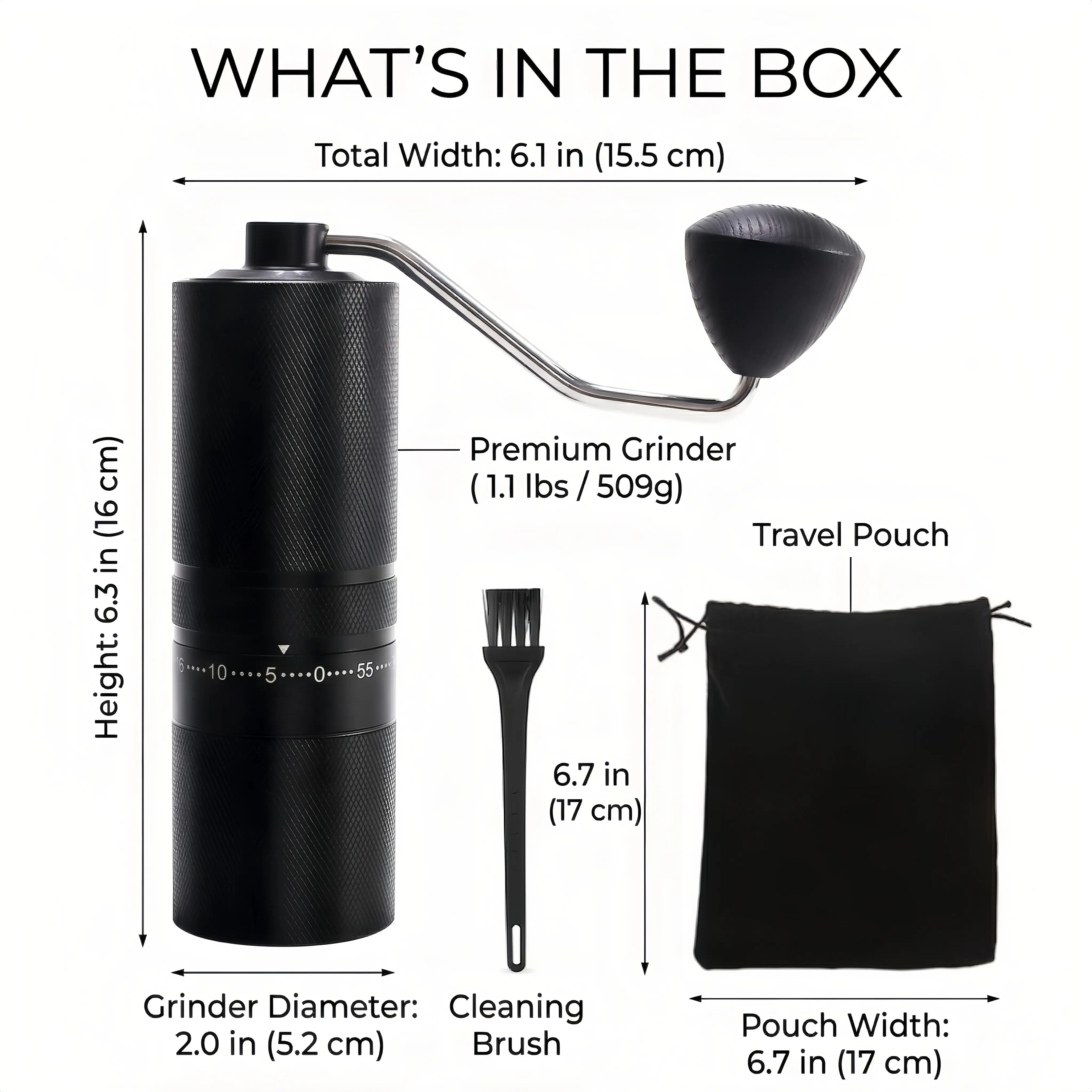 📦 1 x Dwell Premium Manual Coffee Grinder, 1 x Deep Cleaning Brush, 1 x Protective Travel Pouch. Burr Material: 7-Core CNC Machined Stainless Steel. Body Material: Space-Grade Aluminum Alloy. Weight: 1.1 lbs / 509g. Dimensions: 6.3 in (Height) x 2.0 in (Width) | Handle: 6.1 in. Capacity: 20-25g of coffee beans.