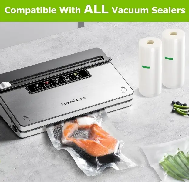 Our 11" x 50' vacuum sealer bags rolls (2 pack) are heavy-duty, BPA-free food storage solutions. Embossed channels create a secure, airtight seal. Prevent freezer burn, dehydration, and leaks. Cut freely for any food. Compatible with all standard vacuum sealers. Safe for freezing, boiling, microwaving, and sous vide (up to 230°F). Ideal for meal prep, kitchen organization, and long-term food storage.