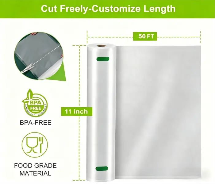 ·11" x 50' Vacuum Sealer Bags Rolls (2 Pack): Heavy-duty, puncture-resistant, BPA-free food grade. Extend freshness 3-6X longer. No freezer burn, locks in flavor & nutrition. Customizable size & universal fit. Food safe & versatile for meal prep, sous vide, freezer storage & kitchen organization.