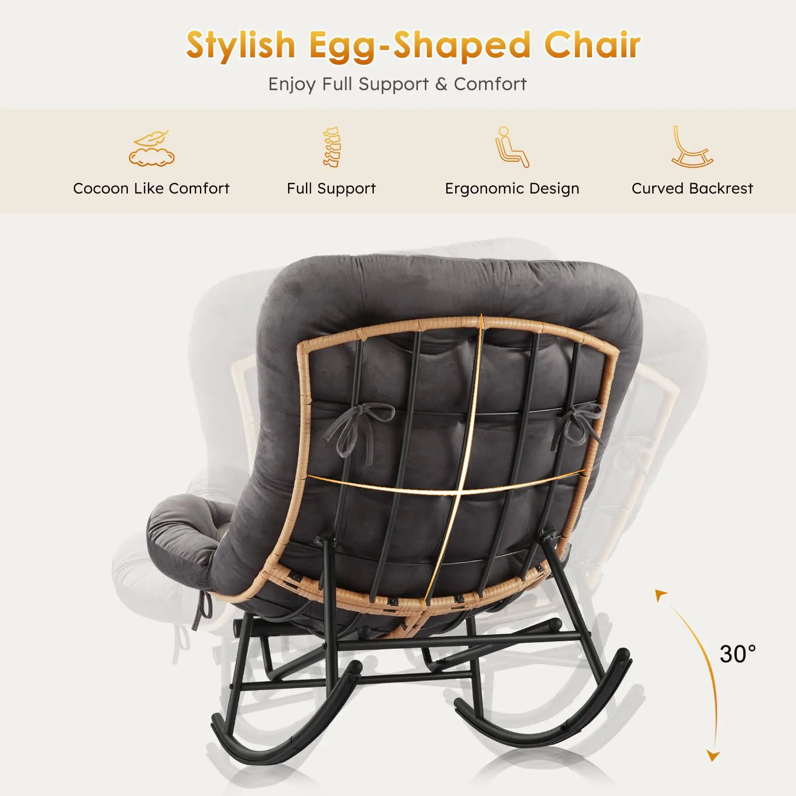 🛋️ Experience the perfect "egg-chair" hug. Our oversized, curved seat (31.5”D x 43”W) is ergonomically shaped for superior support. The smooth 30-degree rocking arc promotes relaxation and stress relief. It’s designed to be soothing without being excessive, ensuring a comfortable and relaxing experience.