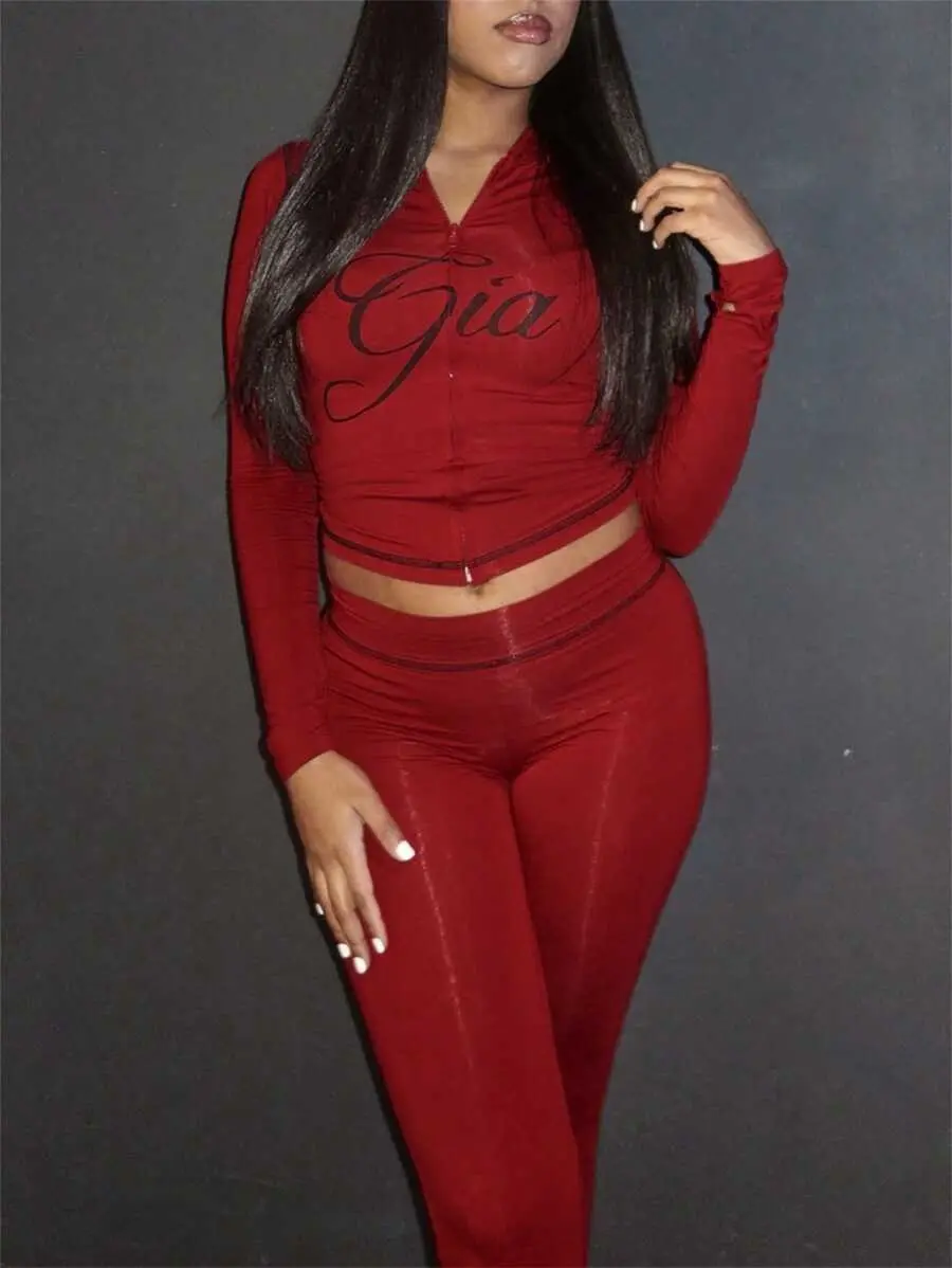 Gia Logo Party Two Piece Set – Y2K Zip Up Crop Top & Flare Pants, Trendy Streetwear for Summer Parties, Pool Days, Memorial Day & Hot Girl Summer 2026, Slim Fit Stretchy Fabric