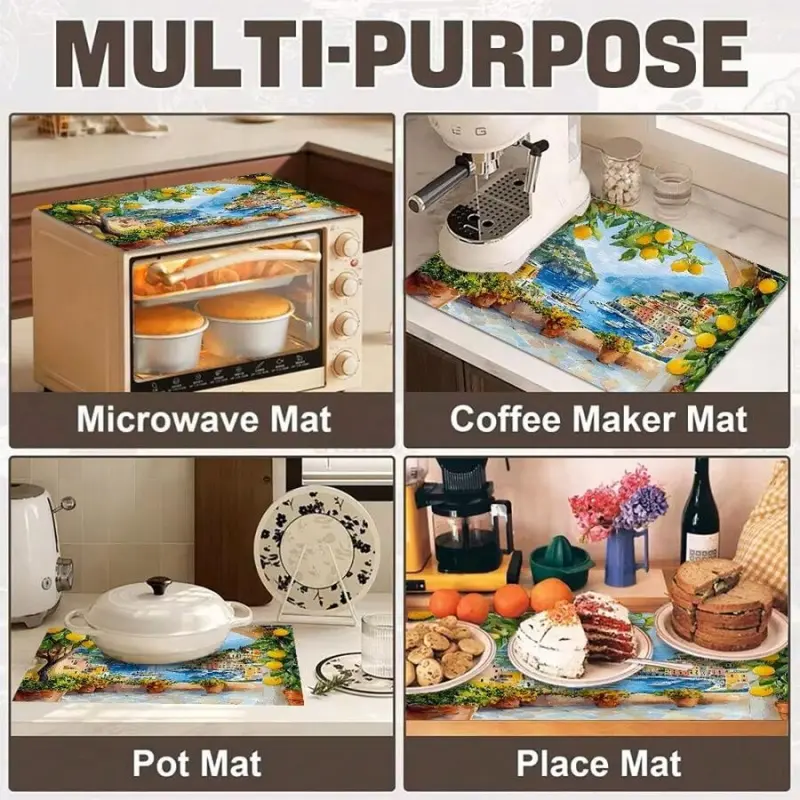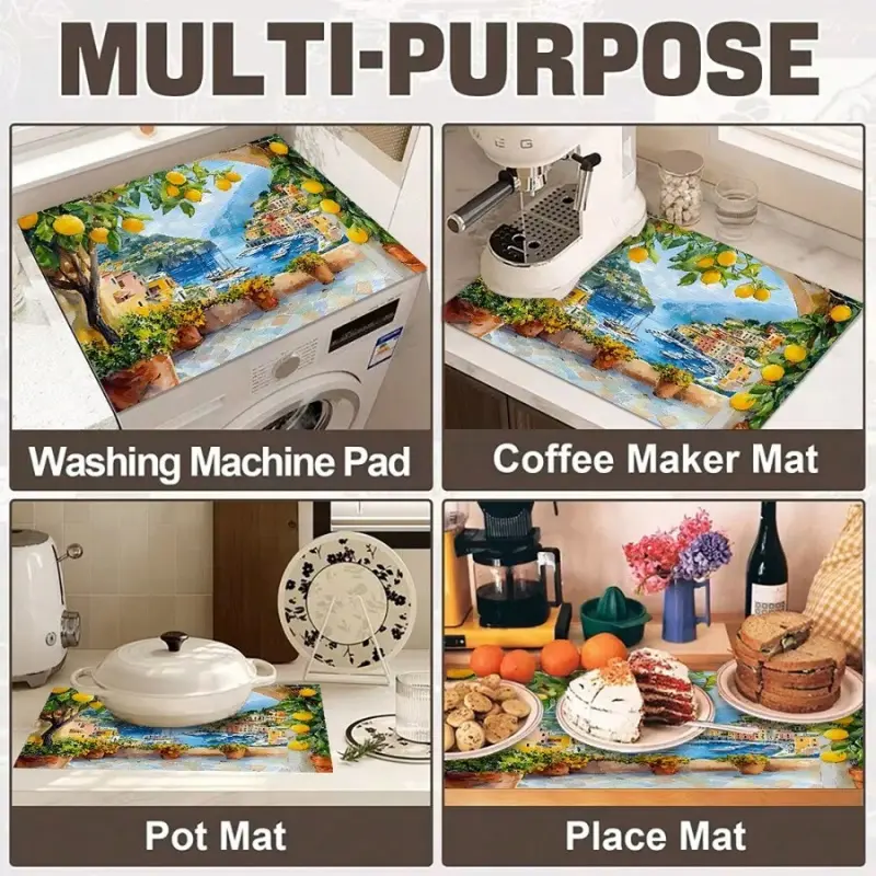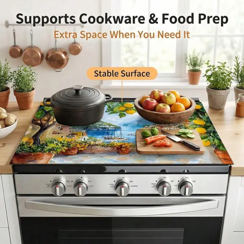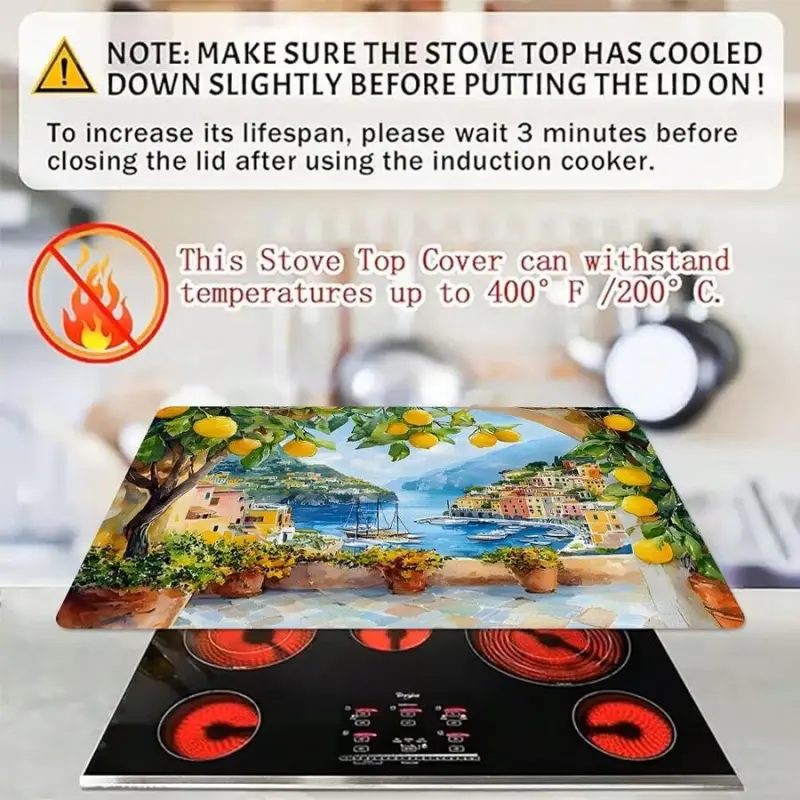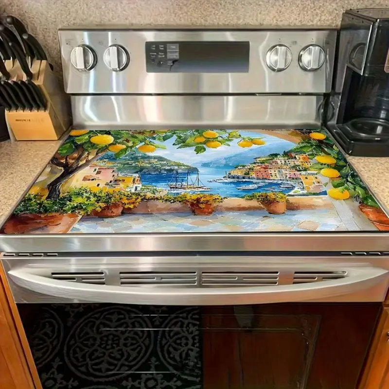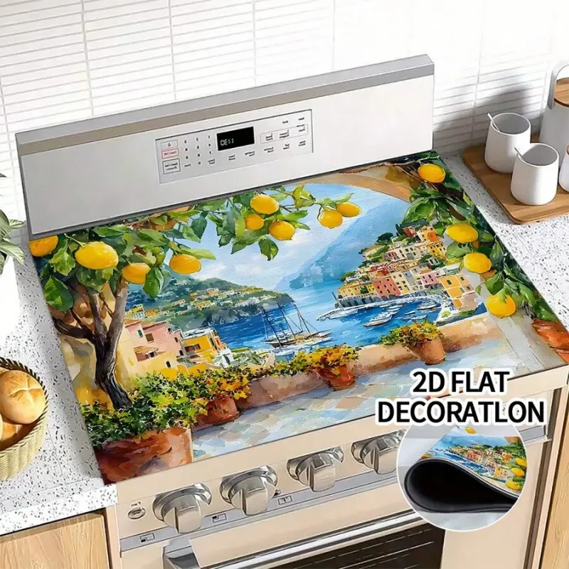 JOYFINITY Single Piece, Brightly Colored Lemon Tree Print, Featuring Coastal Village Architecture. The Stove Cover Is Heat-Resistant, Oil-Proof, Non-Slip, Reusable, And Durable