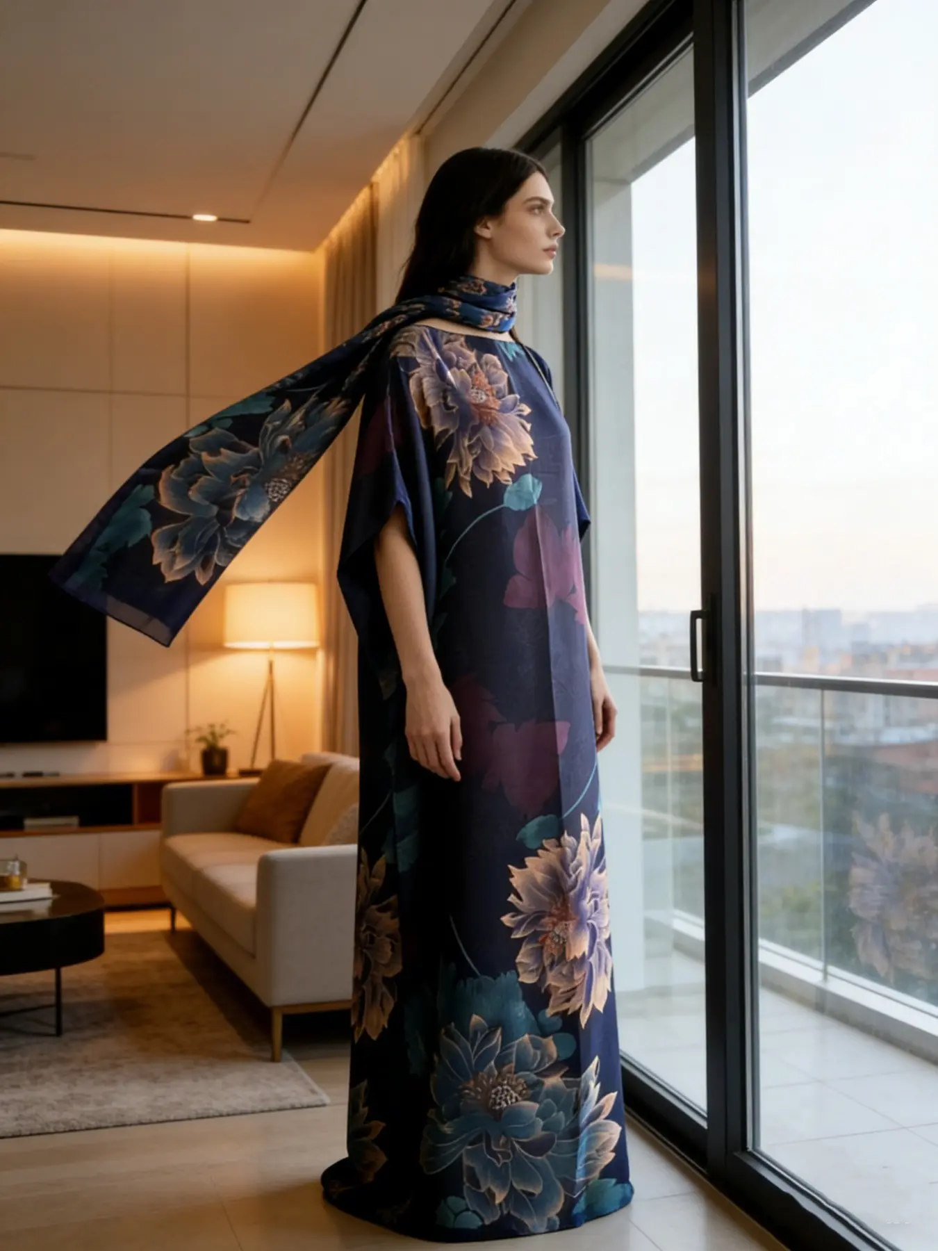 1dress+1scarf Viral Emerald Green Floral Print Satin Kaftan Maxi Dress with Matching Scarf – Silky Loose Fit, Plus Size Friendly, Luxury Loungewear, Beach Cover Up & Evening Party Wear, Must-Have Resort Fashion Piece