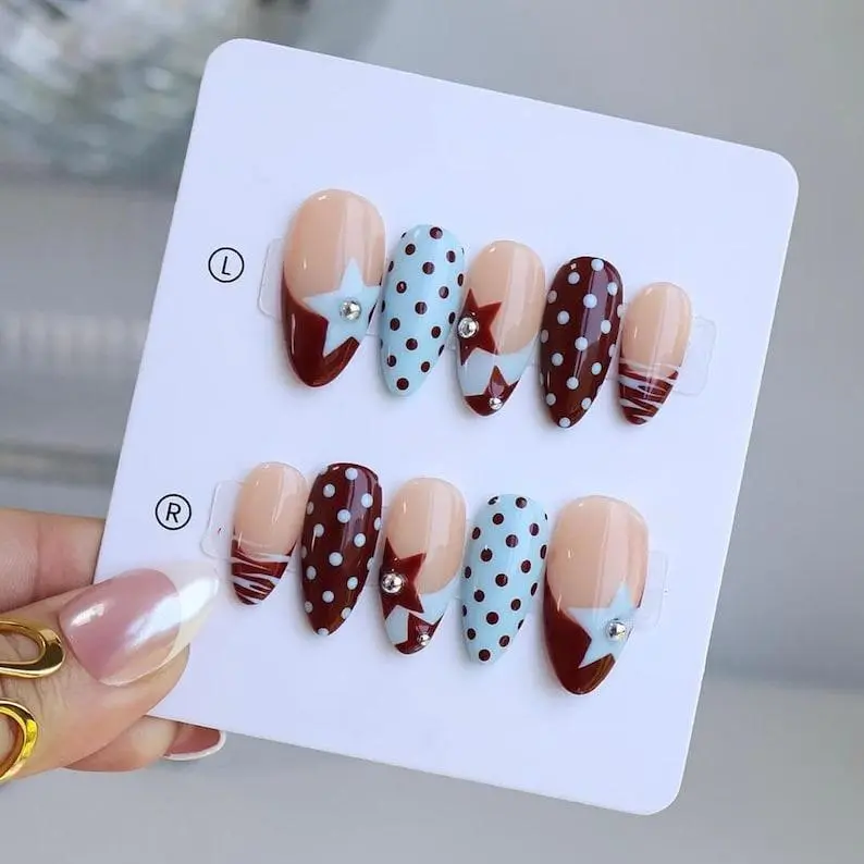 4. Polka Dot Press On Nails with Retro Stars in Red & Blue | Medium Almond Fake Nails | Handmade Vintage Nail Art for Everyday Wear Or Gift