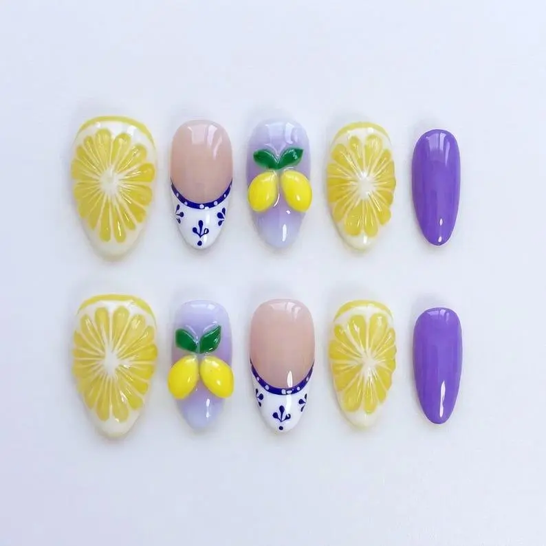 4. Lemon Olive Porcelain Press On Nails|Sicilian Lemon Pastel Nails|Italian Citrus Lavender Nails|Mediterranean Fruit Accent Nail|Lavender Nail