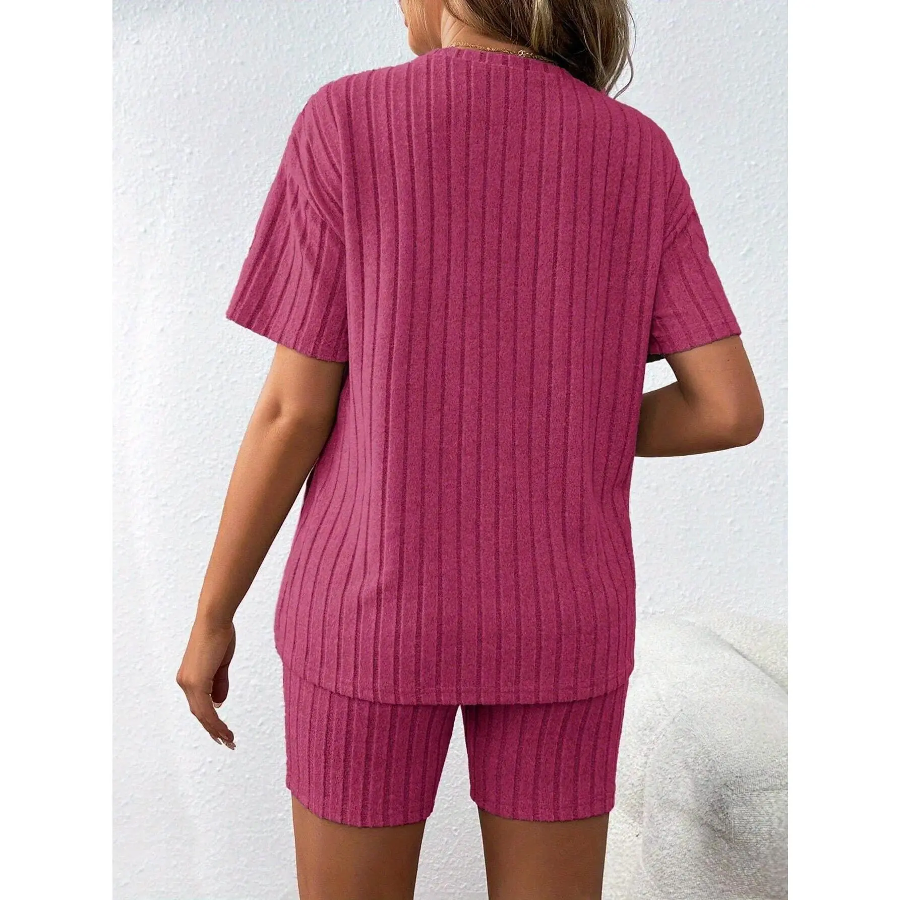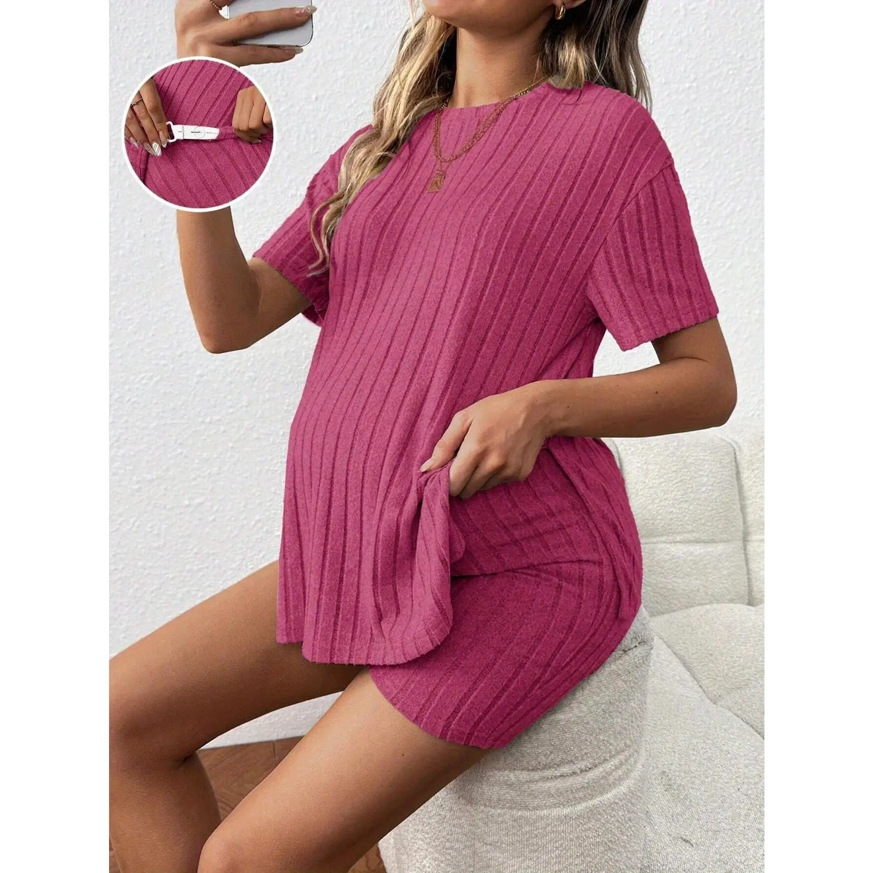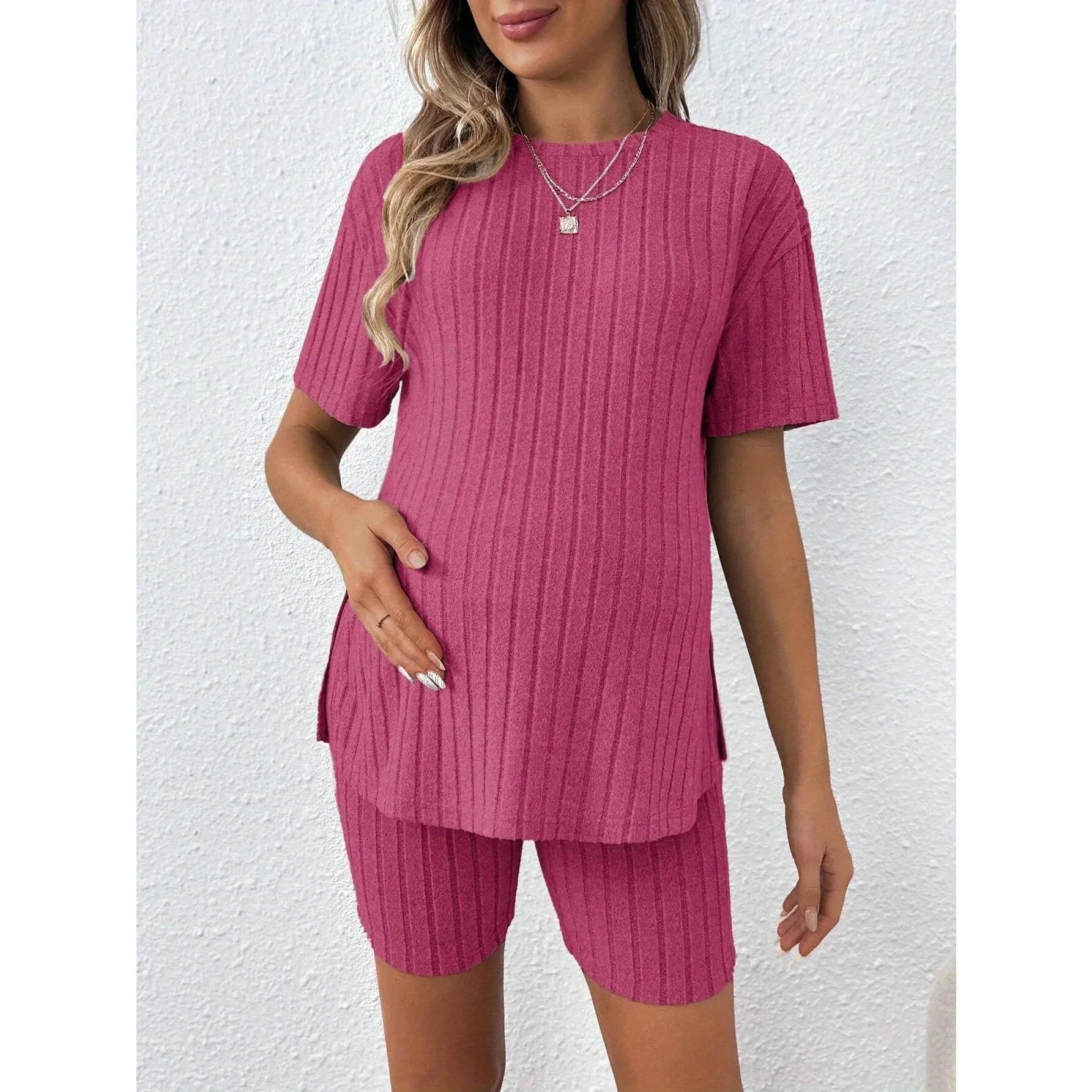 Elevate your summer wardrobe with this versatile maternity two-piece set. Perfect for casual outings, it offers comfort and style. The set includes a loose, stretchy top and matching shorts in a soft pink hue. Ideal for expecting mothers, it ensures ease and flexibility.