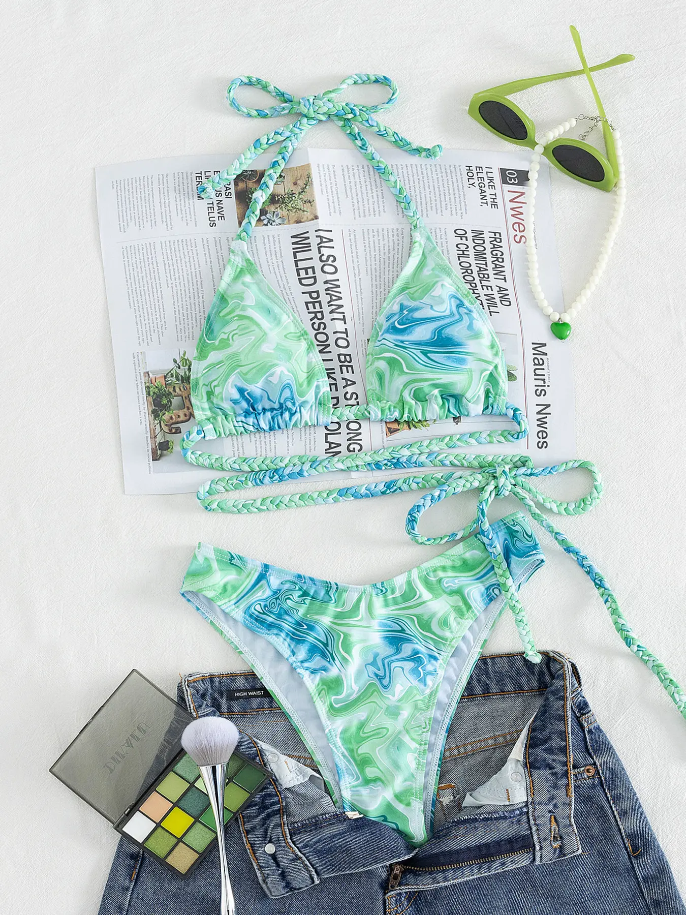 2026 New Ocean Marble Print Halter Bikini, Braided Strap Tie Waist Two Piece Swimsuit, High Cut Summer Beach Vacation Swimwear