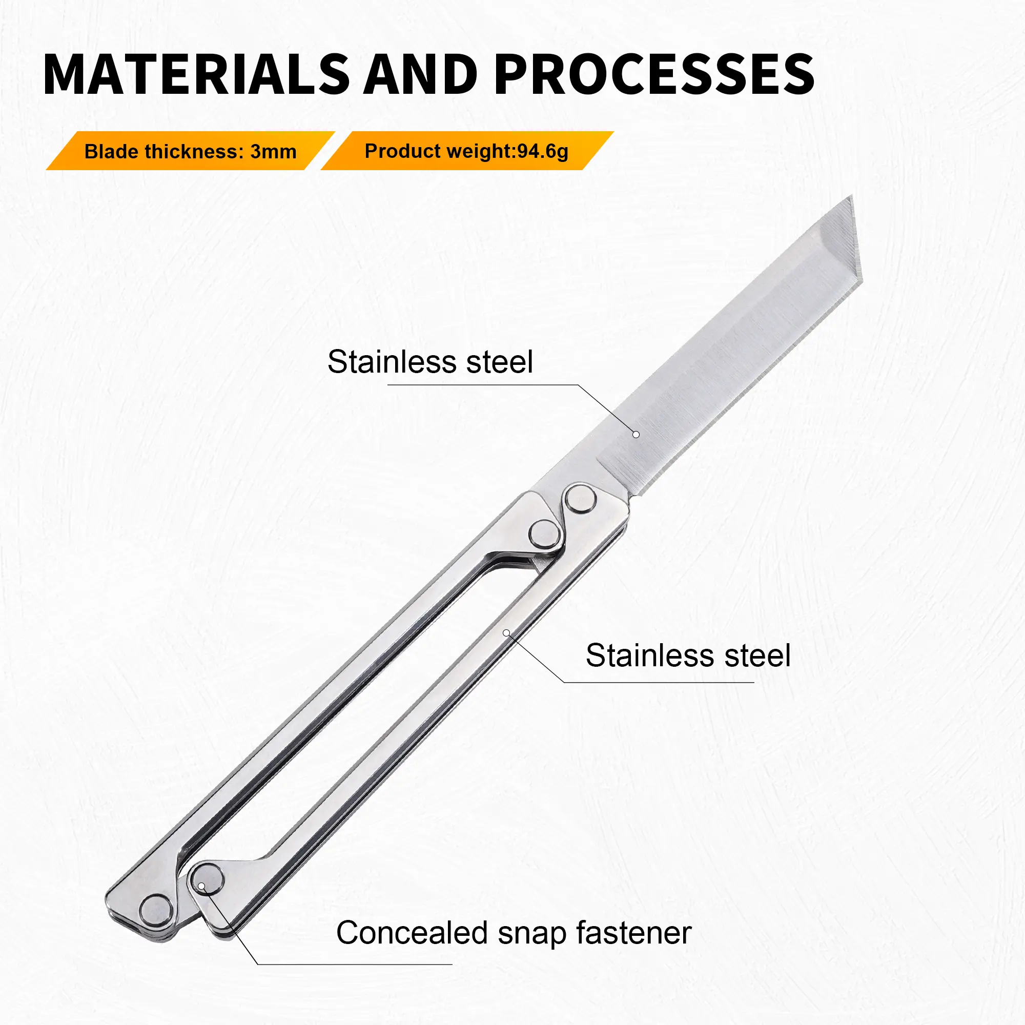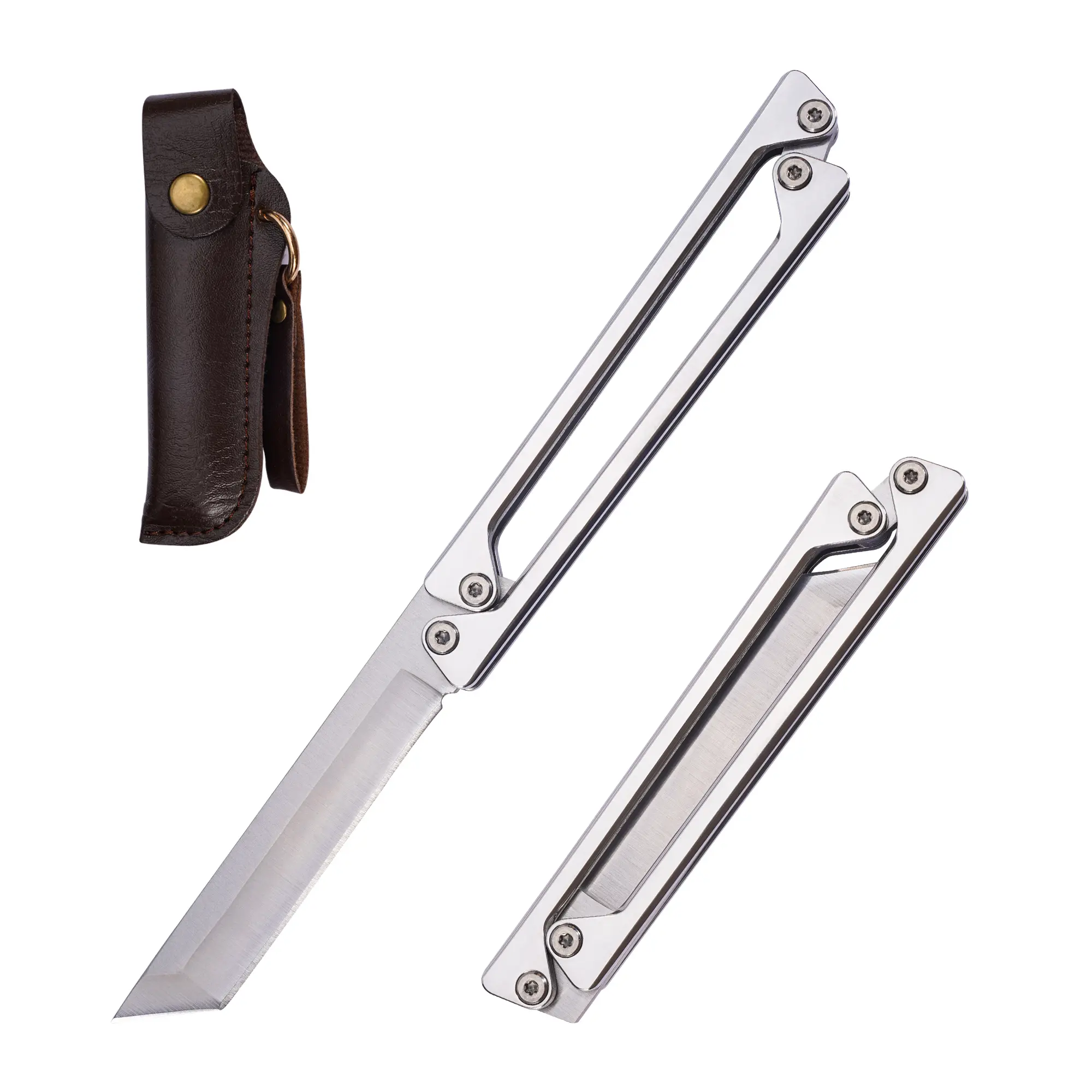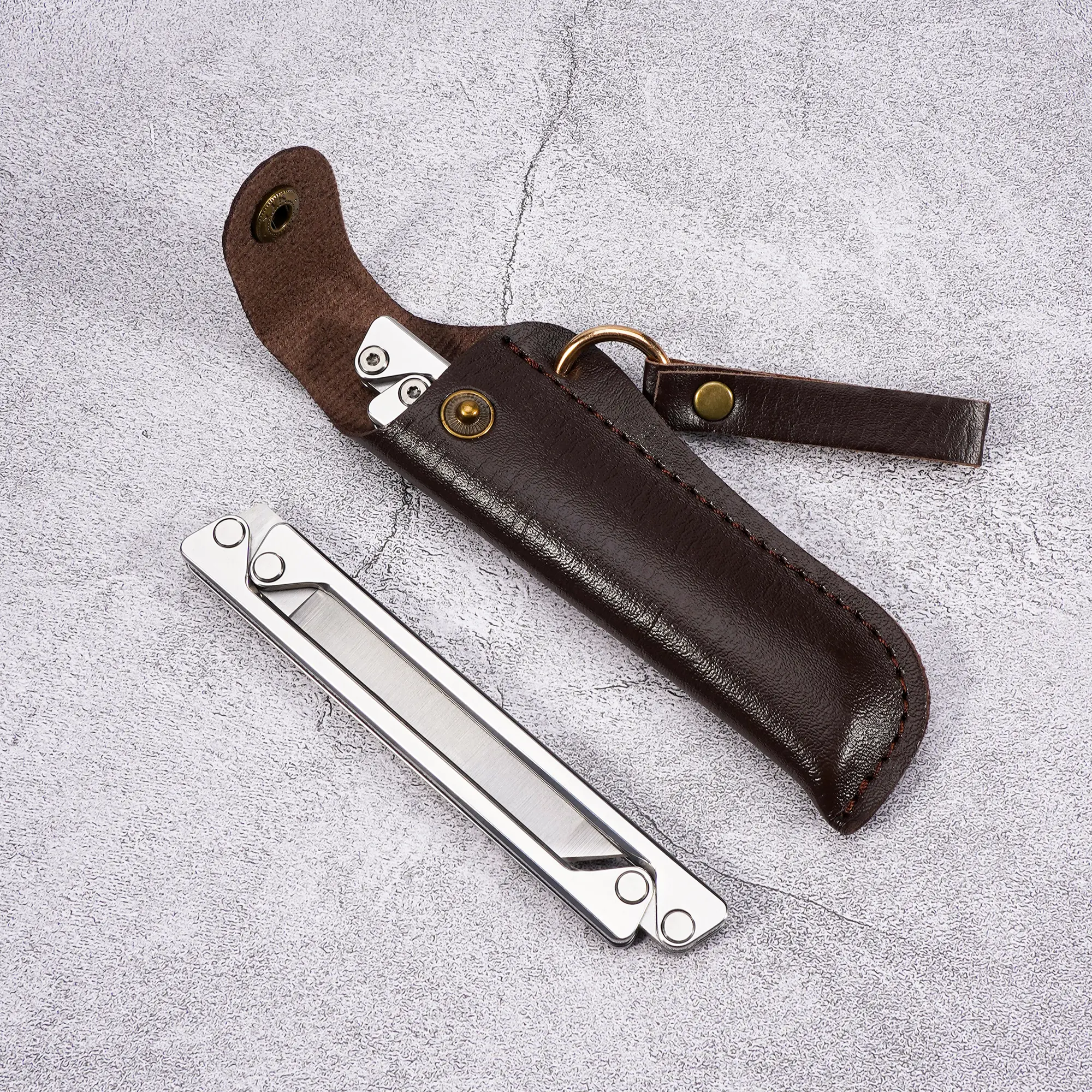 Portable EDC multifunctional tactical outdoor folding knife and pocket knife. Made entirely of steel with a leather sheath; outdoor cutting tools designed specifically for climbing and fishing; essential gear for camping and hiking.