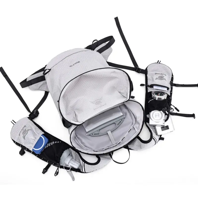 1.Spacious & Versatile: This hiking backpack is designed for day trips, with a roomy main compartment and multiple pockets to keep you organized.The drawstring closure allows for easy access and the interior compartment can hold a 2L hydration bladder.Two side pockets accommodate water bottles, and additional zippered compartments on the front and top provide quick access to small item.This pack also features trekking pole attachments