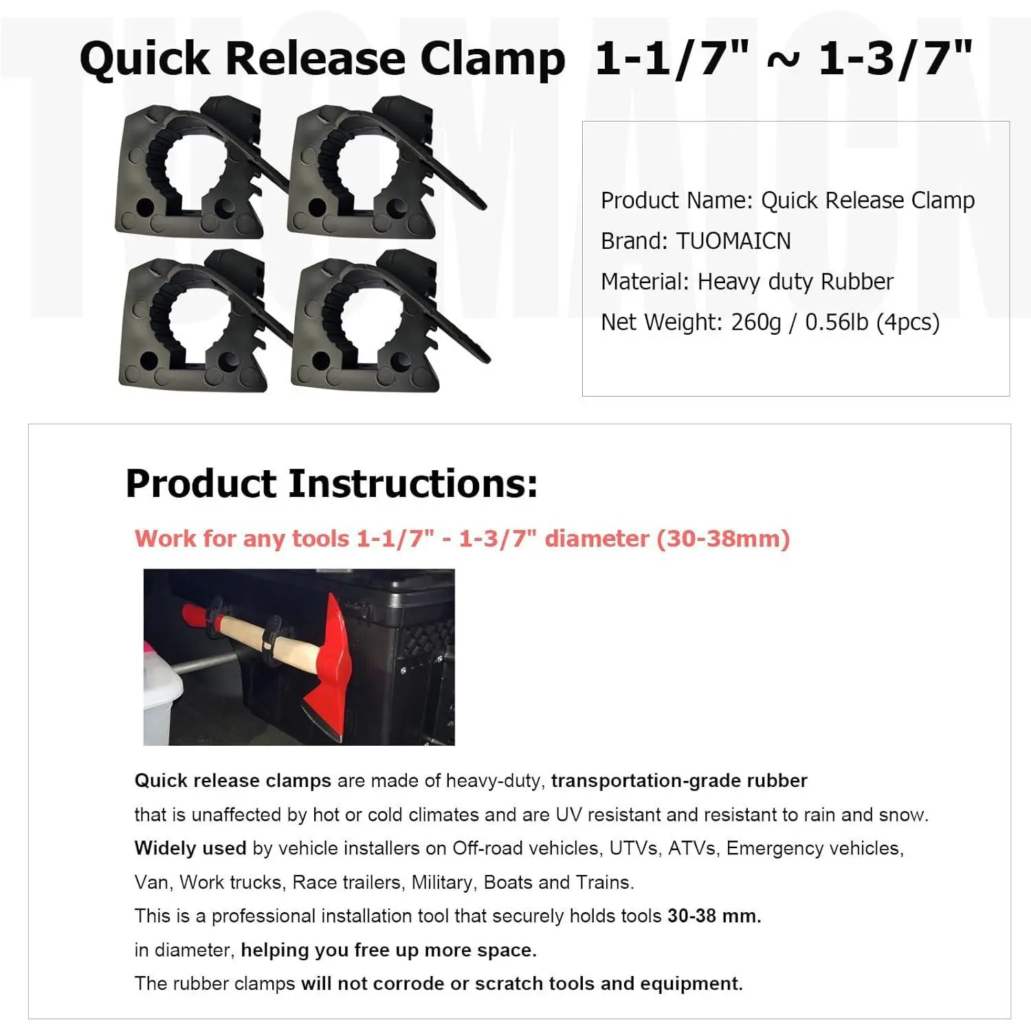 Quick-Release Clamp Mount used for off-road vehicles, hunting trucks, trailers, ATV, UTV, also a solution for garage organization, securing shovels, axes, hoses, fishing gear...