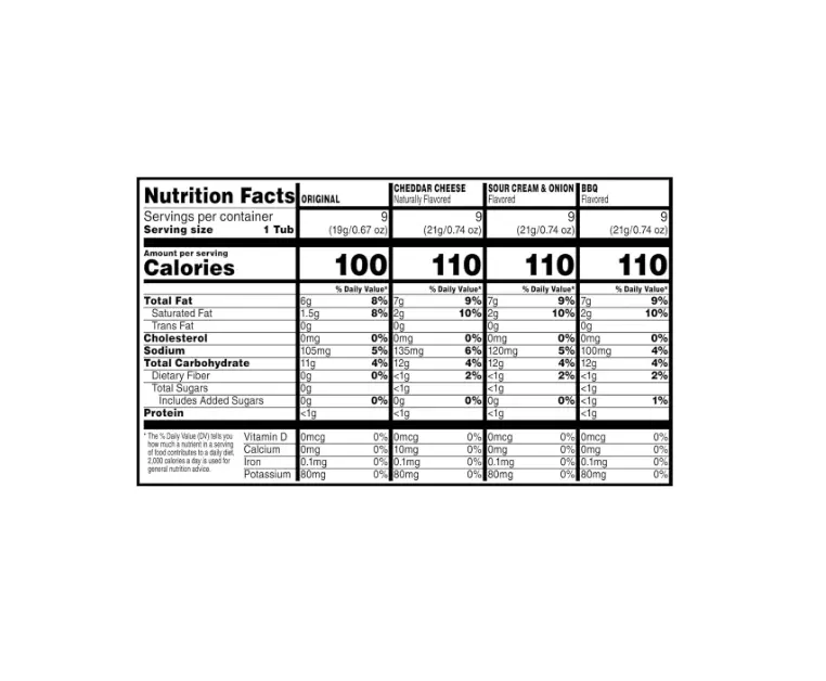 | Ingredients | Original: DRIED POTATOES,VEGETABLE OIL (CORN,COTTONSEED,HIGH OLEIC SOYBEAN,AND/OR SUNFLOWER OIL),DEGERMINATED YELLOW CORN FLOUR,CORNSTARCH,RICE FLOUR,MALTODEXTRIN,MONO- AND DIGLYCERIDES,SALT,WHEAT STARCH. Cheddar Cheese: DRIED POTATOES,MONO- AND DIGLYCERIDES.CONTAINS 2% OR LESS OF WHEY,MONOSODIUM GLUTAMATE,COCONUT OIL,SUGAR,NATURAL FLAVORS,ONION POWDER,CITRIC ACID,CHEDDAR CHEESE (PASTEURIZED MILK,CHEESE CULTURES,ENZYMES),BLUE CHEESE (PASTEURIZED MILK,BUTTERMILK,BUTTER (CREAM,SALT),LACTIC ACID,NONFAT MILK,PAPRIKA EXTRACT COLOR,DISODIUM INOSINATE,DISODIUM GUANYLATE,TURMERIC EXTRACT COLOR,YEAST EXTRACT,AUTOLYZED YEAST EXTRACT,WHEAT STARCH. Sour Cream and Onion: DRIED POTATOES,MONO- AND DIGLYCERIDES.CONTAINS 2% OR LESS OF SALT,WHEY,SOUR CREAM (CREAM,CULTURES),DEXTROSE,SODIUM CASEINATE,MALIC ACID,INVERT SUGAR,CULTURED NONFAT MILK,CREAM,WHEAT STARCH. BBQ: DRIED POTATOES,TOMATO POWDER,SPICE,GARLIC POWDER,HYDROLYZED CORN PROTEIN,MALTED BARLEY FLOUR,WHEAT STARCH. |