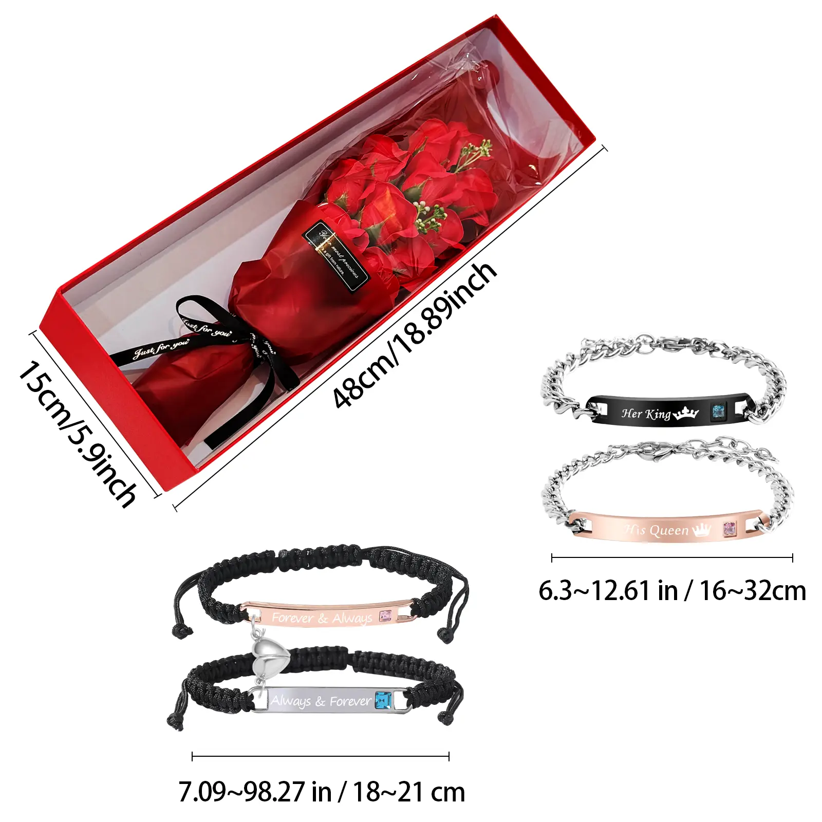 The set includes adjustable rhinestone bracelets, ensuring a perfect fit. The eternal foam roses are a symbol of enduring love. This gift set is a heartfelt choice for special occasions, combining elegance and sentiment.