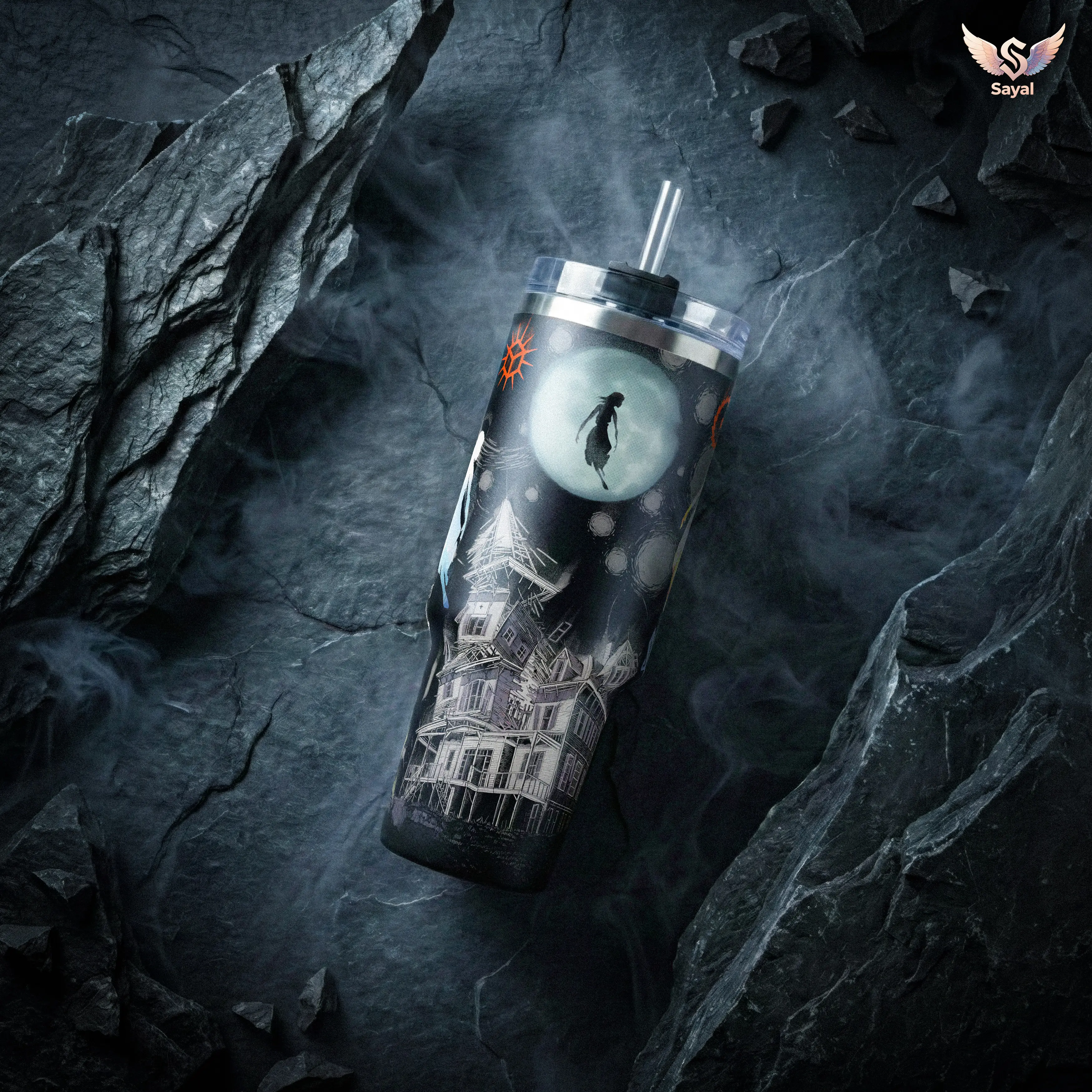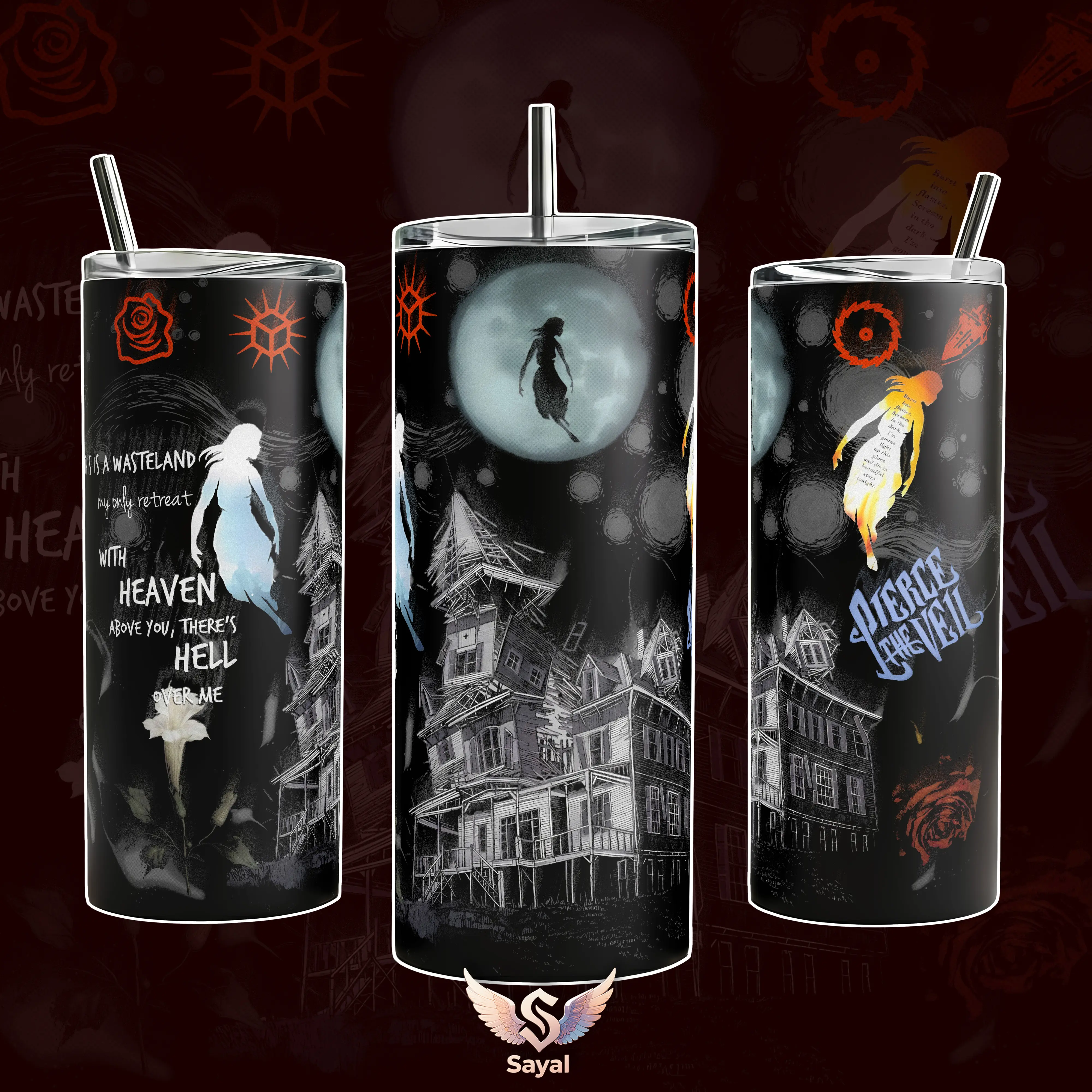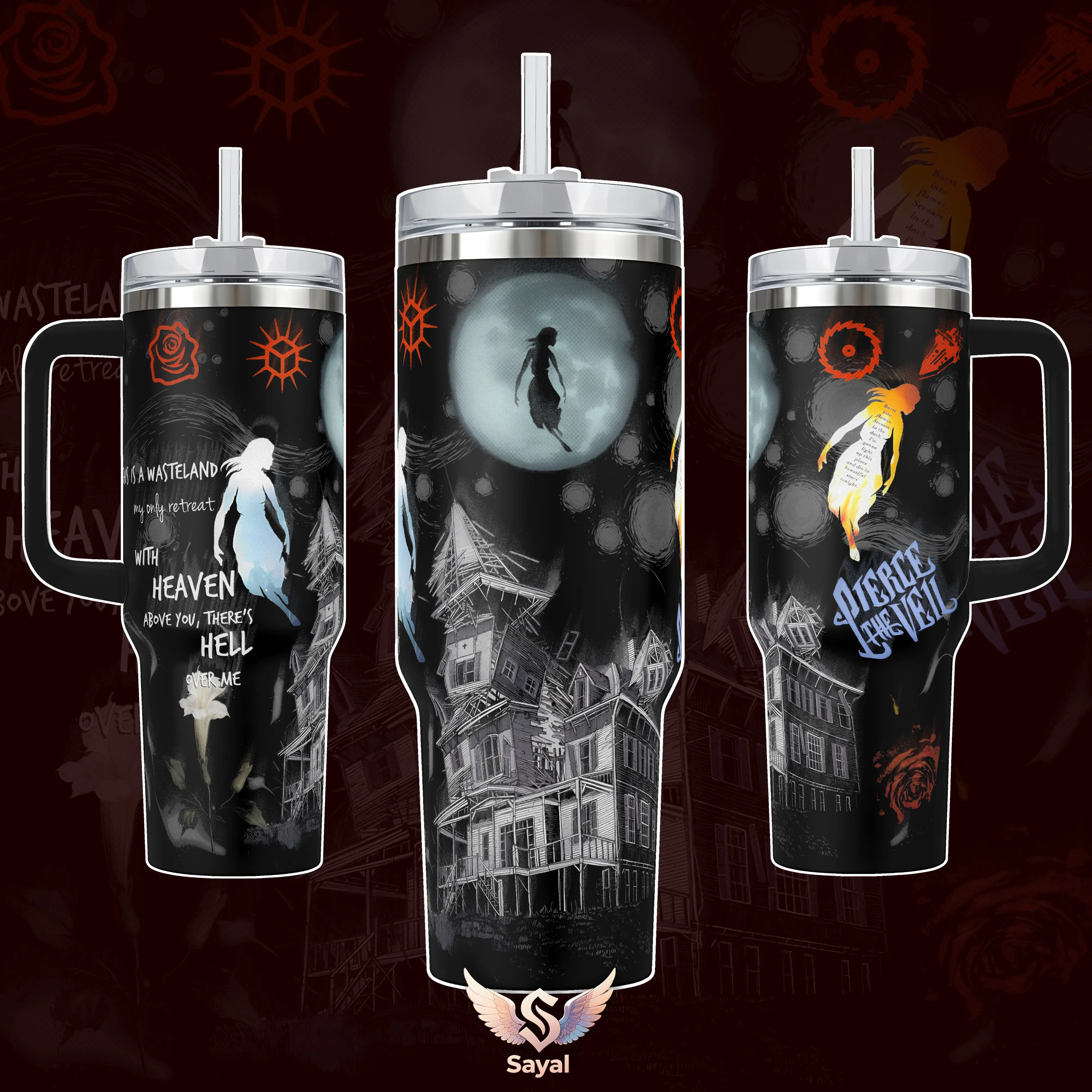 Pierce the Veil Collidre With The Sky Album Hell Above 40 oz Vacuum Insulated Tumbler with Handle Straw Graphic Keeps Drinks Hot/Cold 12H+ 18/8 Stainless Steel Travel Mug Emo Fans Alternative Music Lovers Dark Aesthetic Merch Gift