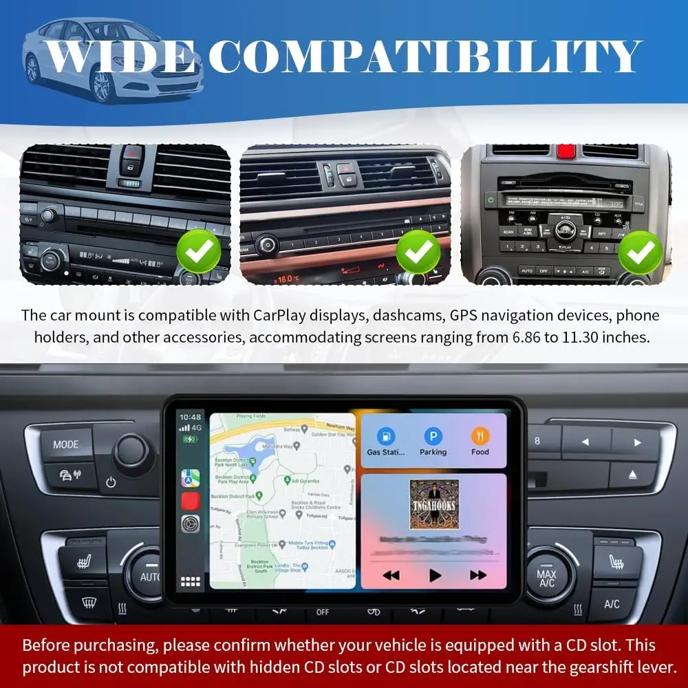 ·Wide Compatibility: CarPlay mount widely compatible with CarPlay screen, dashcam, GPS, phone holder, etc, compatible with 6.86-11.30 inch screen, before buying, check whether your car has a CD slot, and it does not apply to hidden CD slot, or CD slot close to the gearshift lever