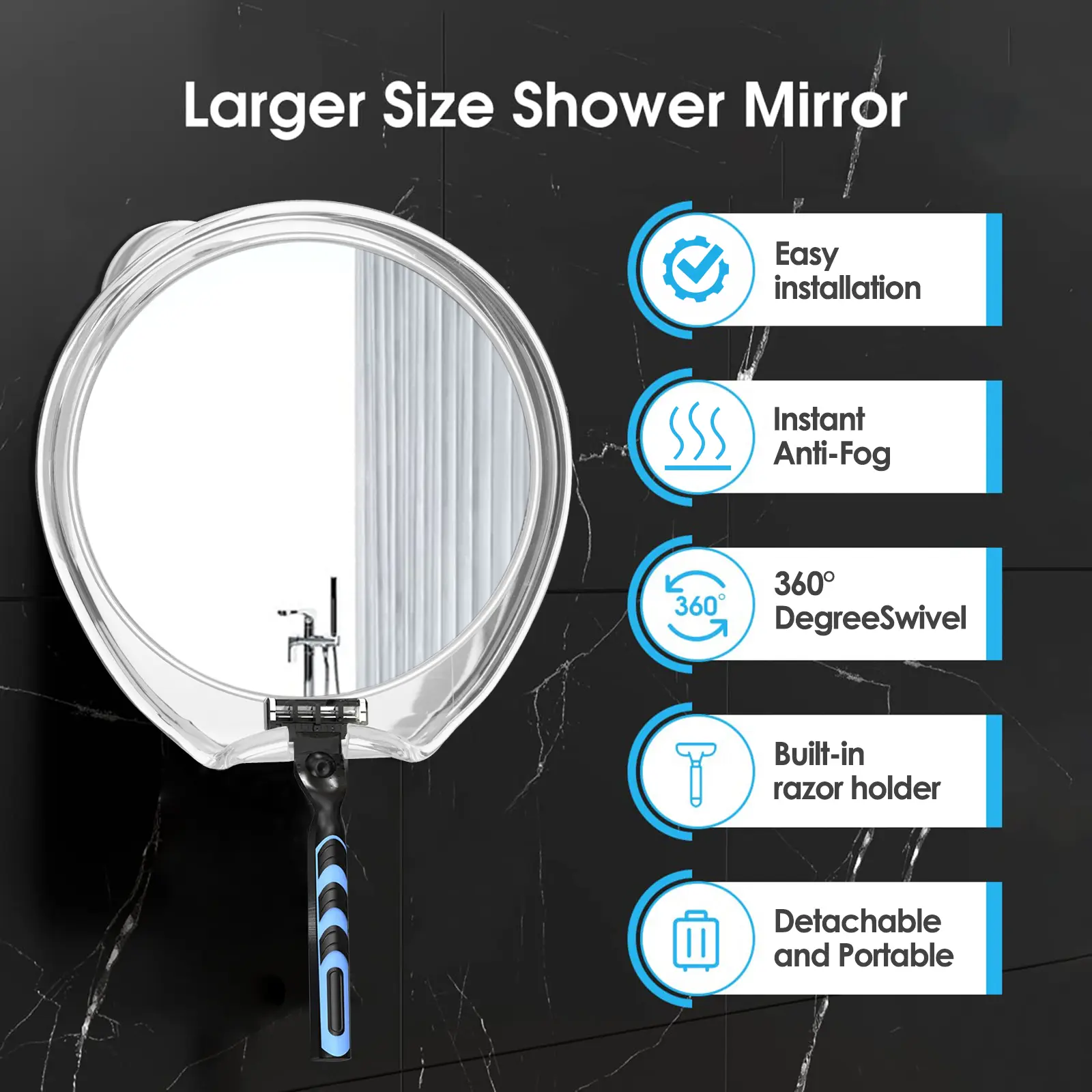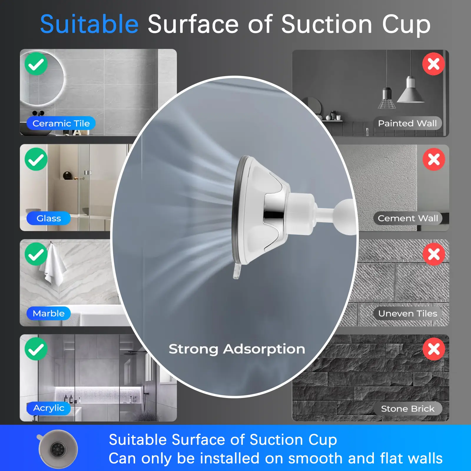 【Strong Suction Cup Mount】Securely attaches to any smooth surface (tiles, glass, mirrors) without damaging walls.