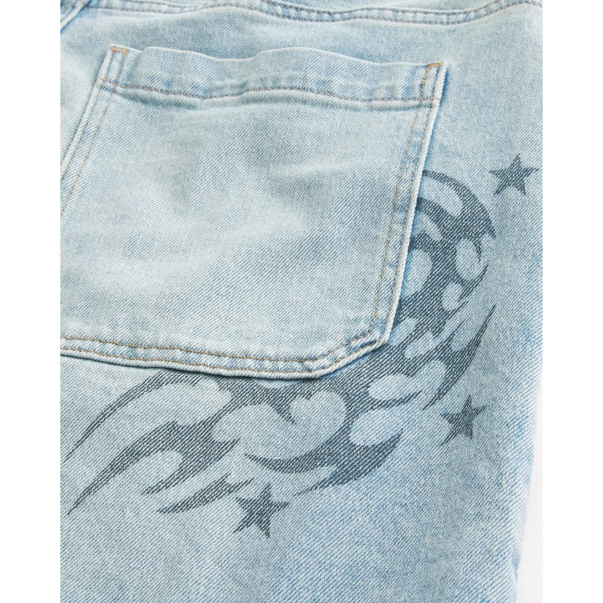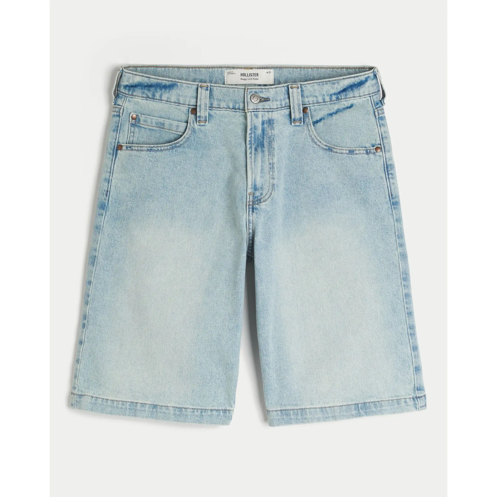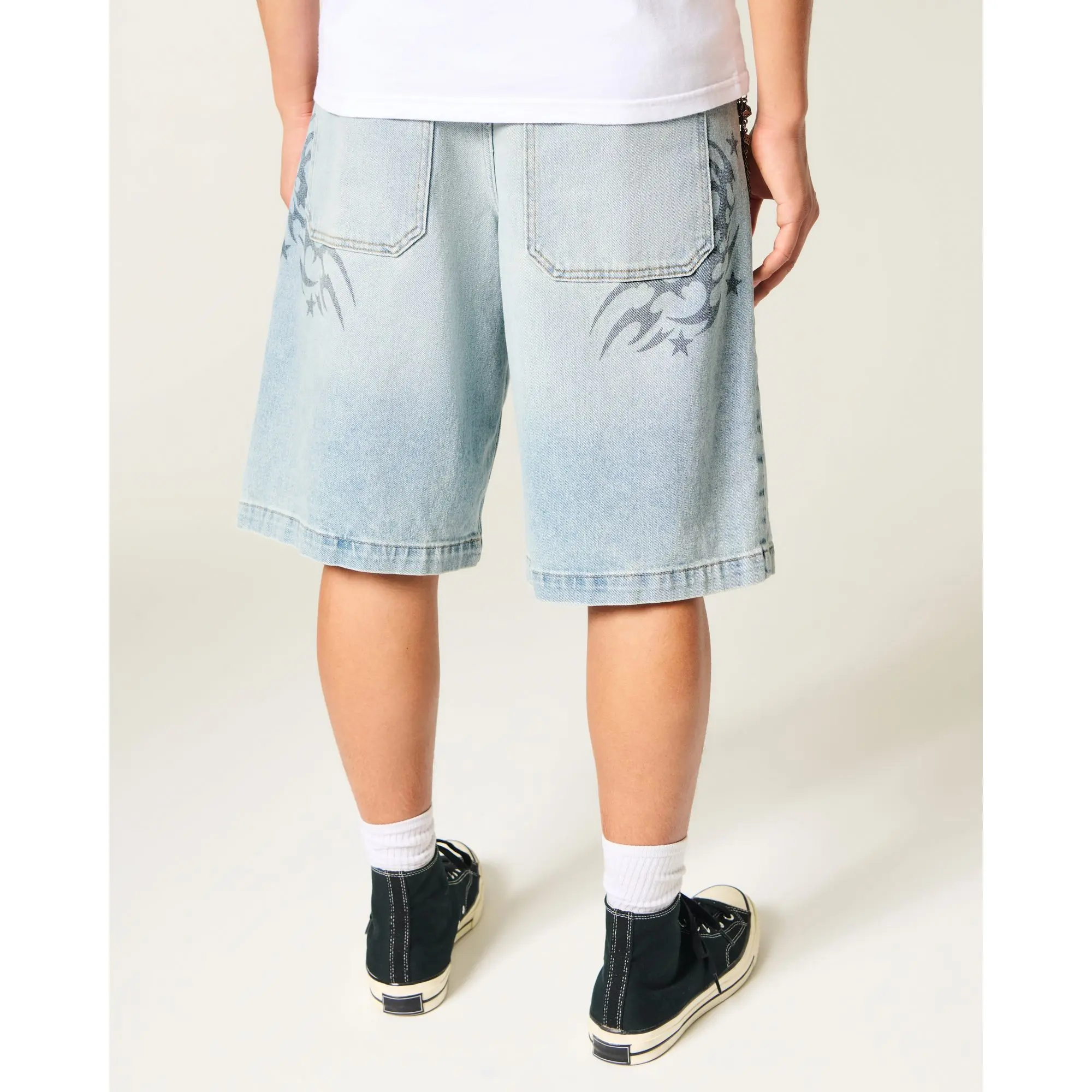 Classic denim shorts designed with a low-rise waist and baggy fit. Light wash, back graphic, fading. Imported.