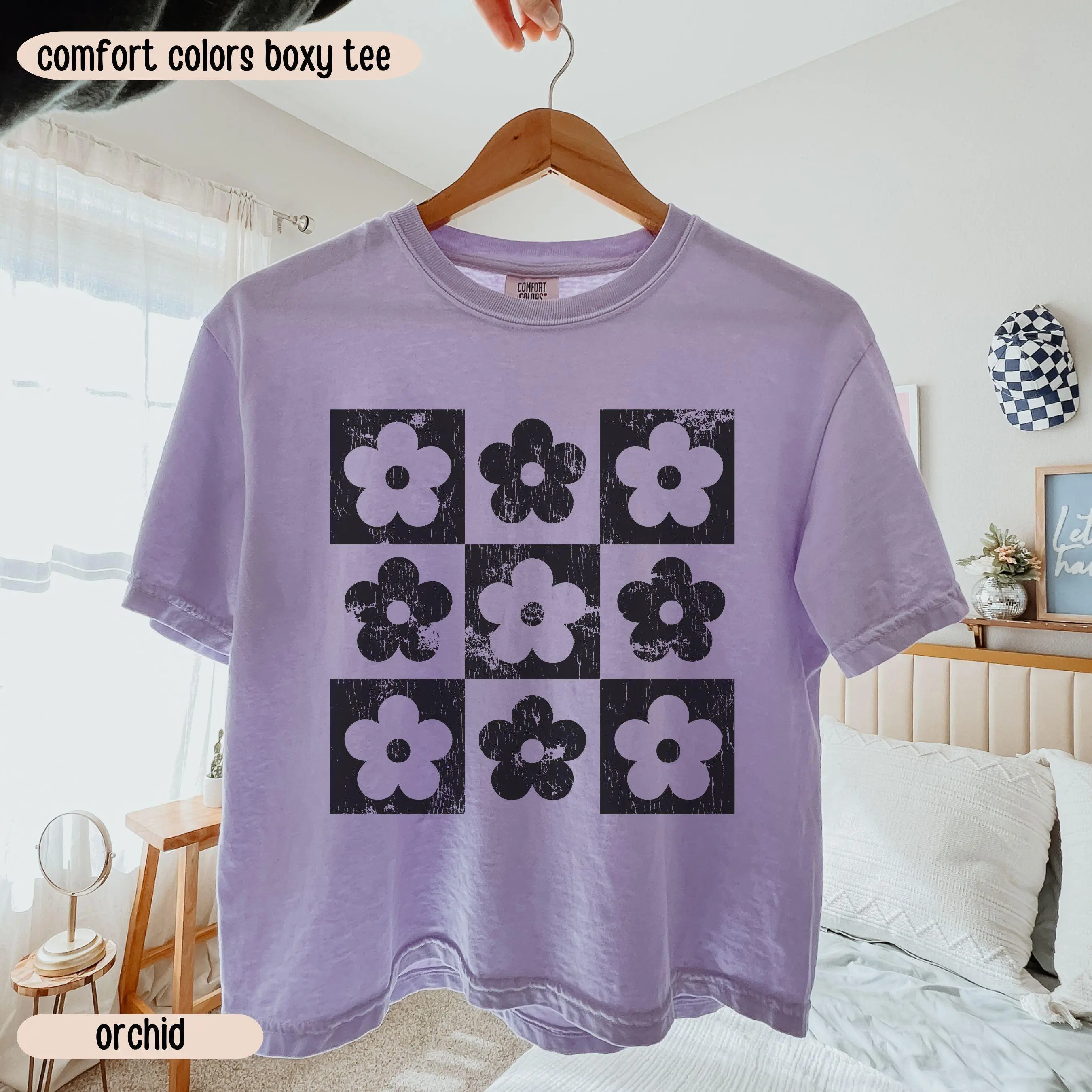 Comfort Colors Boxy Crop Top Checkered Flowers Crop Tee Boho Floral Boxy Tee Gift For Mom Spring T Shirt Trendy Floral Cropped Tee