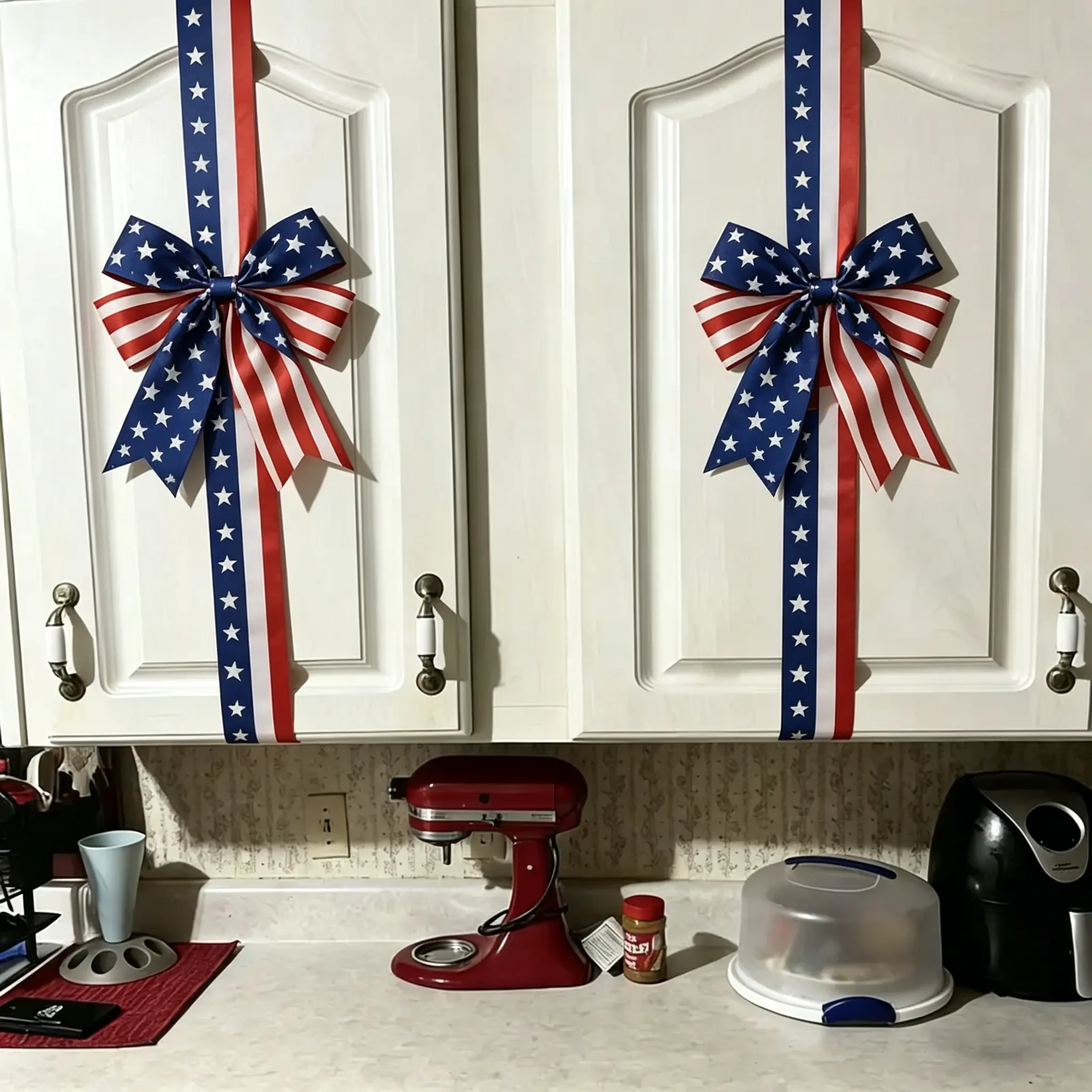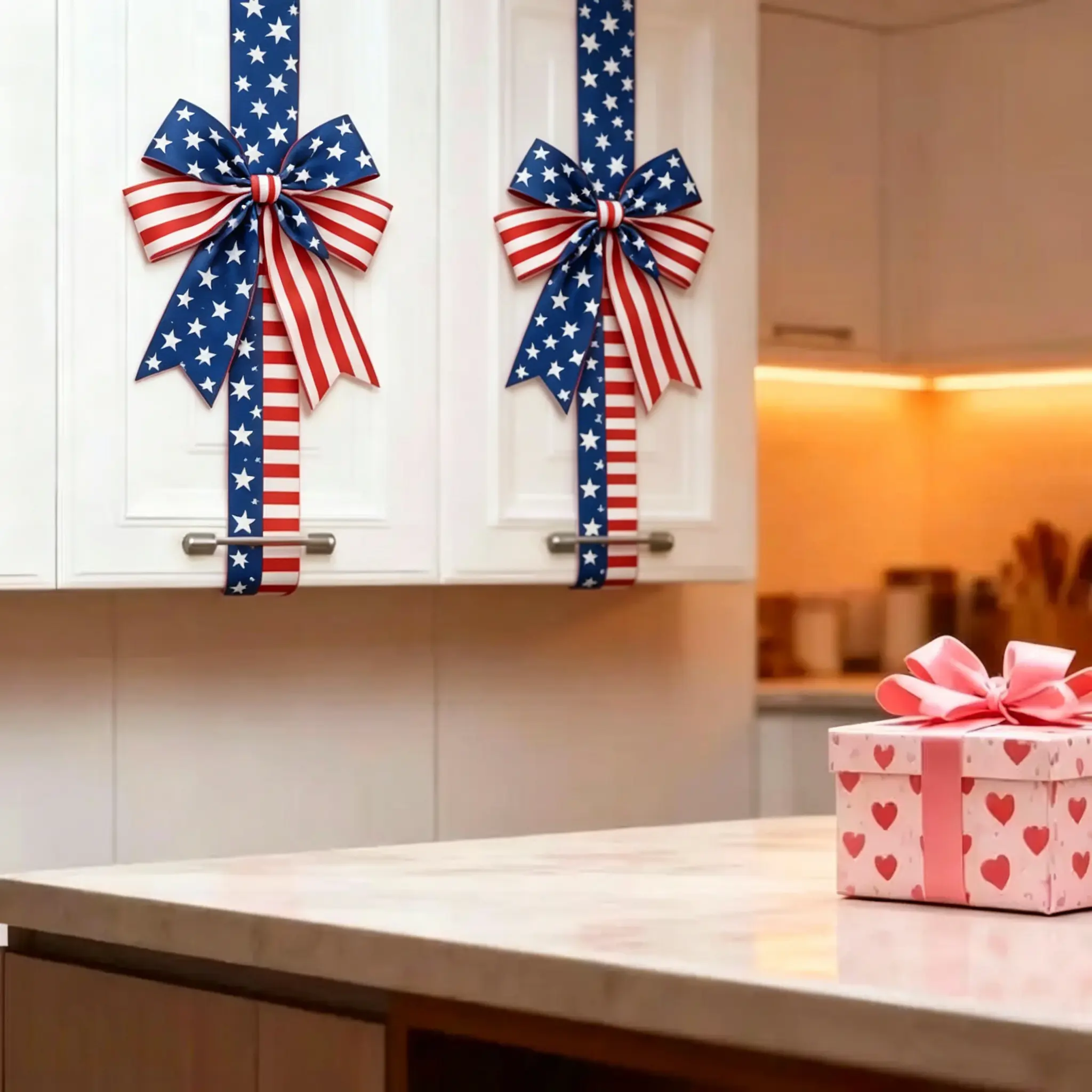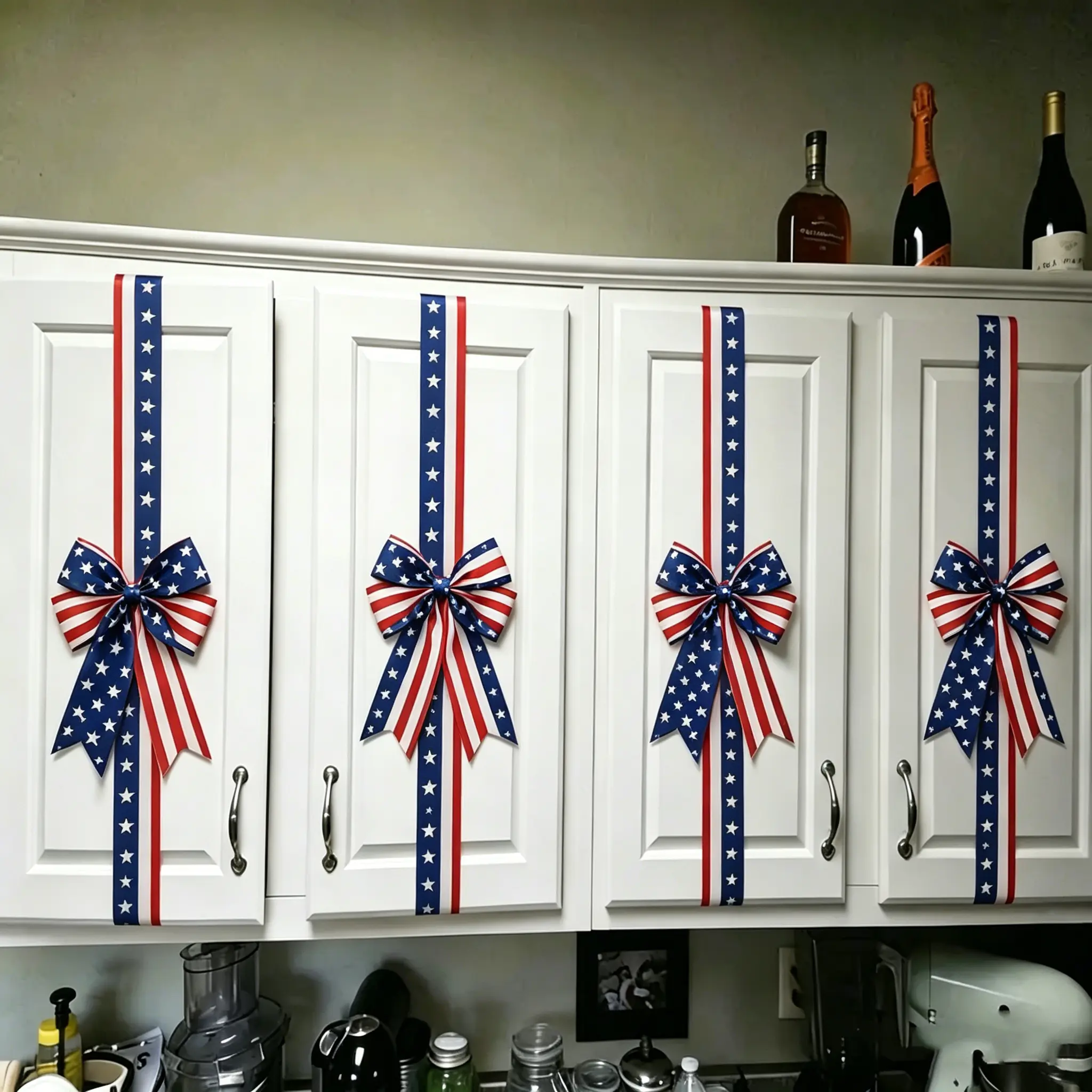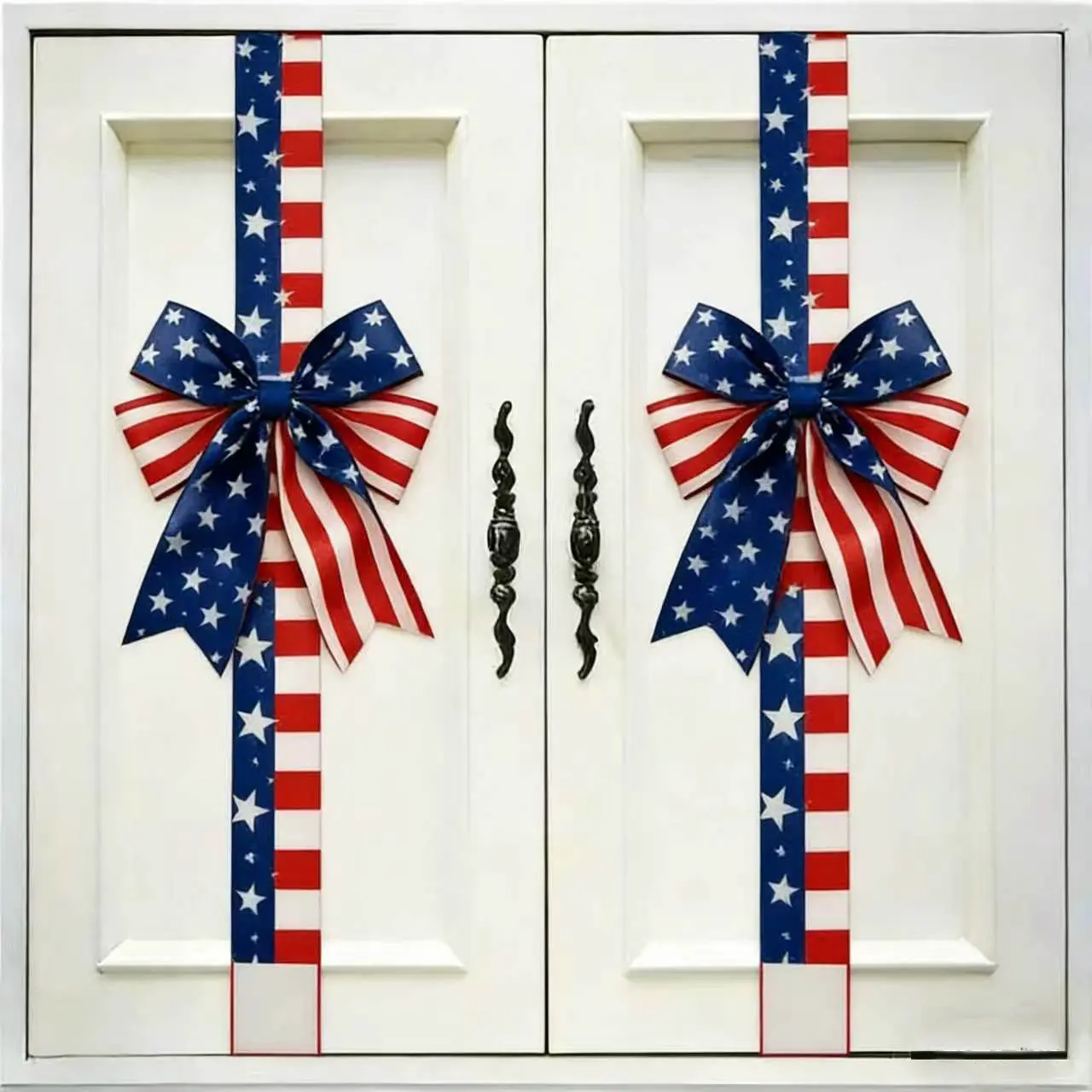 Designed to elevate your kitchen, living room, or entryway, this cabinet door fringe bow wreath features a classic patriotic star print on a crisp white base, blending timeless red, white, and blue hues to honor our nation’s heroes and celebrate the spirit of freedom. Measuring 79 x 2.4 inches, it’s perfectly sized to wrap around cabinet doors, adorn windows, or hang on walls, creating an eye-catching, festive focal point in any space.