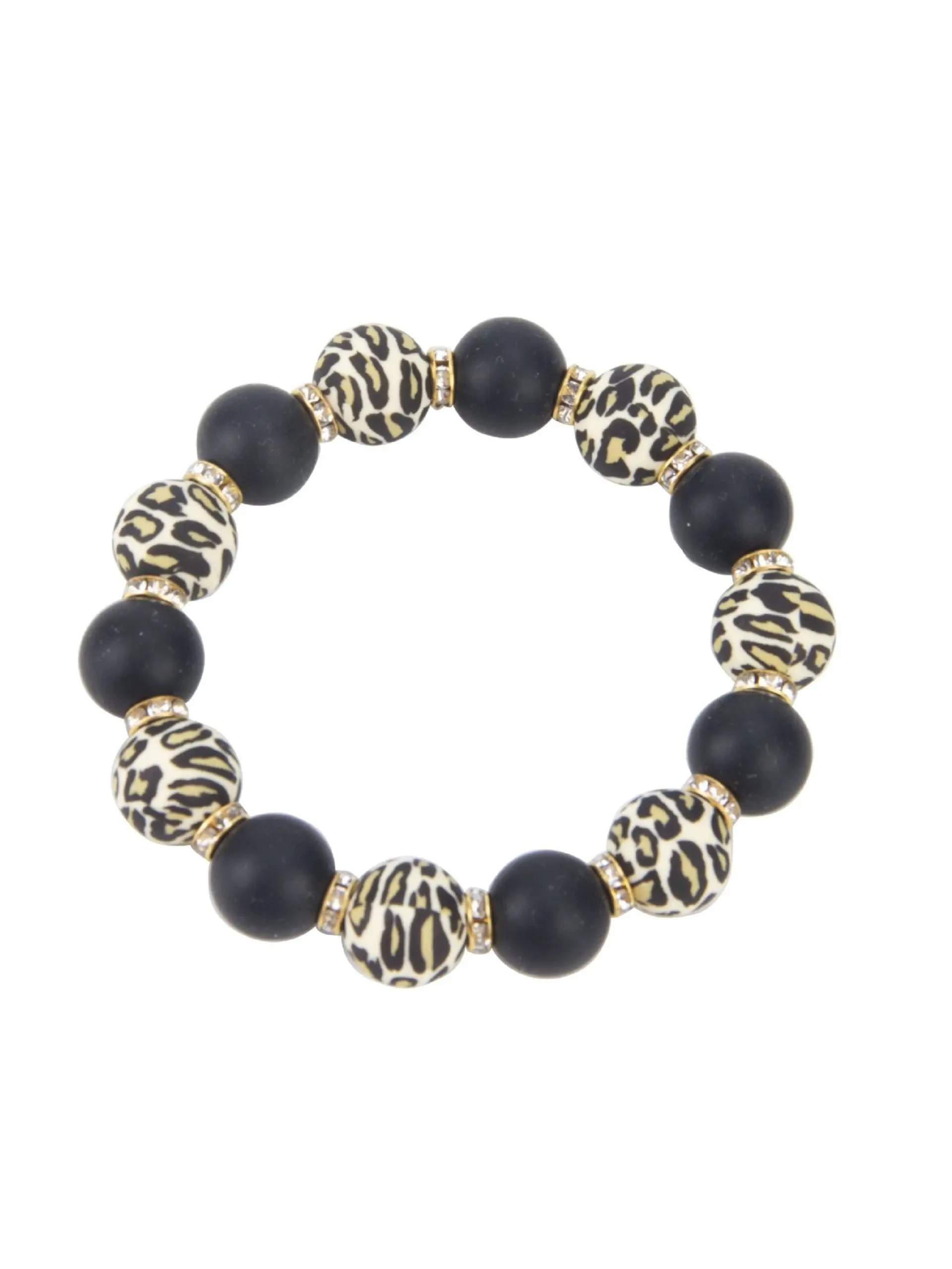 Leopard Print PU Leather Wallet Keychain for Women, Wooden Bead Bracelet, Silicone Pearl Credit Card Holder, Boho Style Accessories