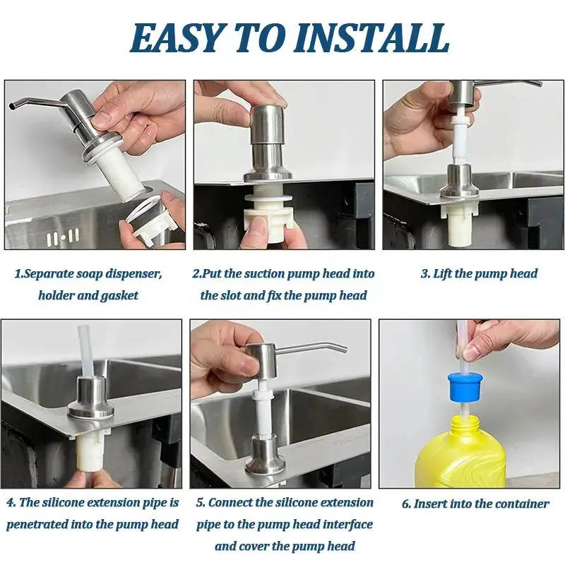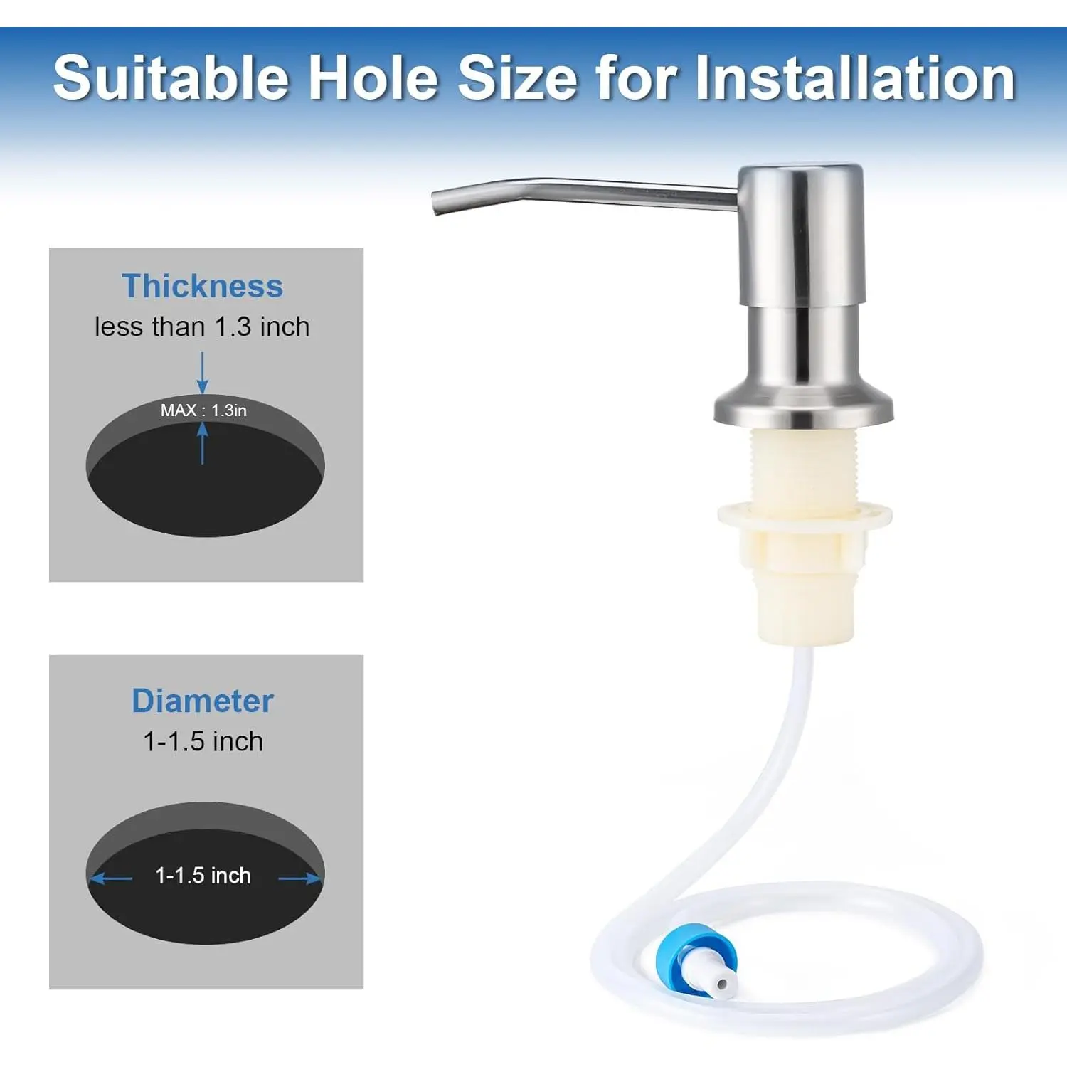 Easy to Install: Following the installation guide, you can easily install our sink soap dispenser in just a few minutes. Please make sure the hole diameter of the sink is within 1-1.5 inches before purchasing, otherwise it can't be installed successfully.