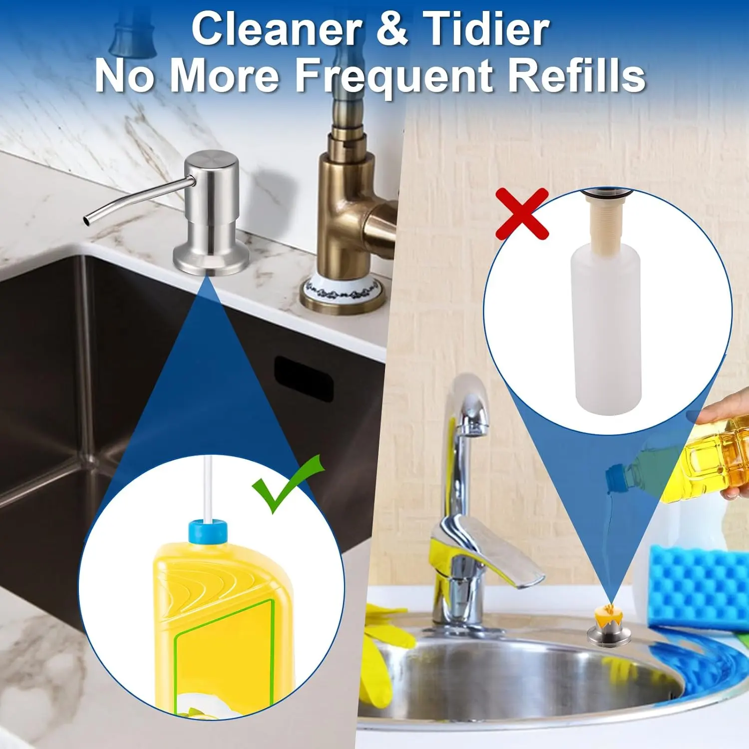 No More Frequent Refills: The built in sink soap dispenser comes with a 40-inch extension tube that goes directly into a large dish soap container. No more crawling under the sink and say goodbye to frequent refills.
