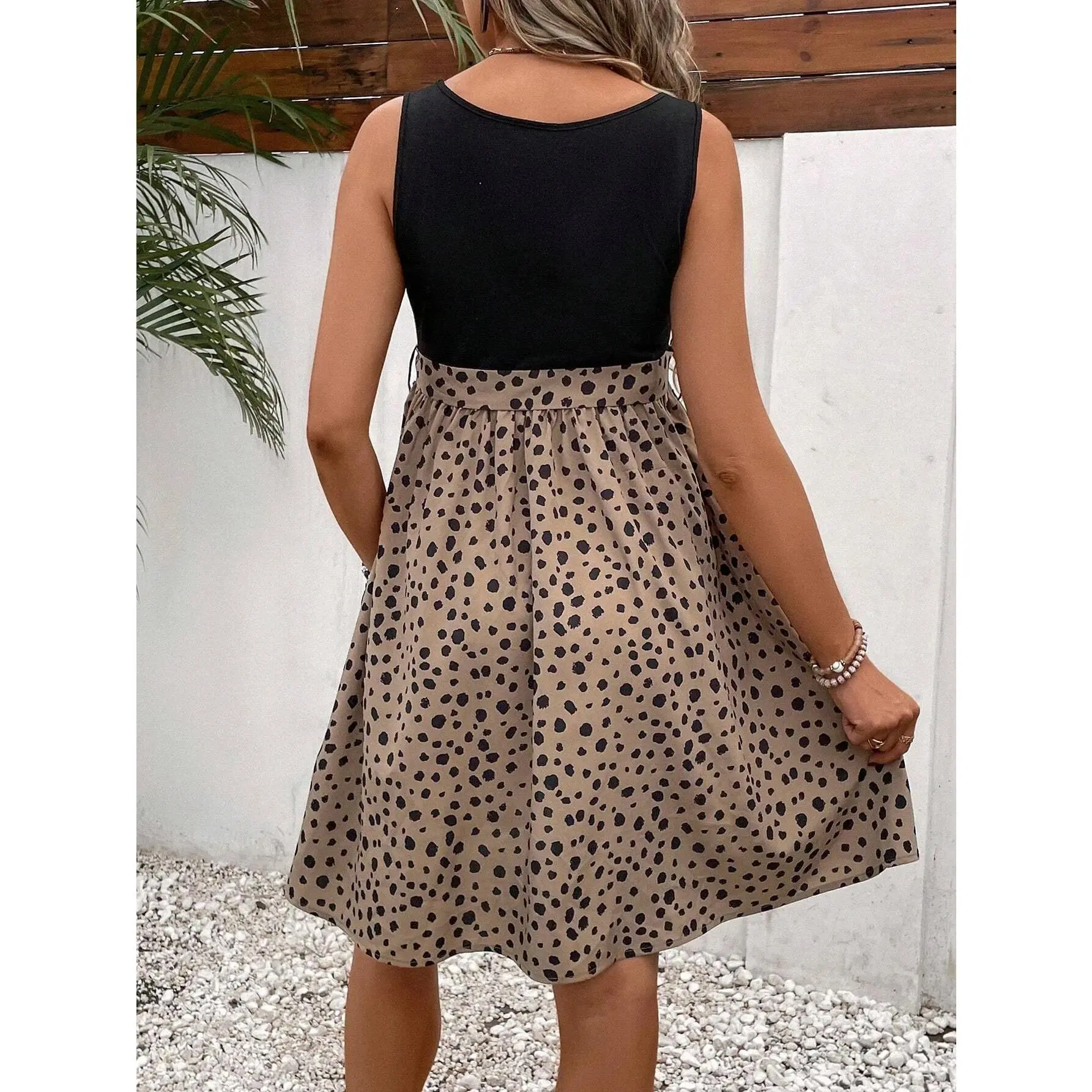 This slip dress is designed for pregnant women, offering comfort and style. It's a short maternity dress ideal for warm weather. The dress features a playful polka dot pattern, adding a fun touch to your summer wardrobe. Pair it with a simple top for a chic look.