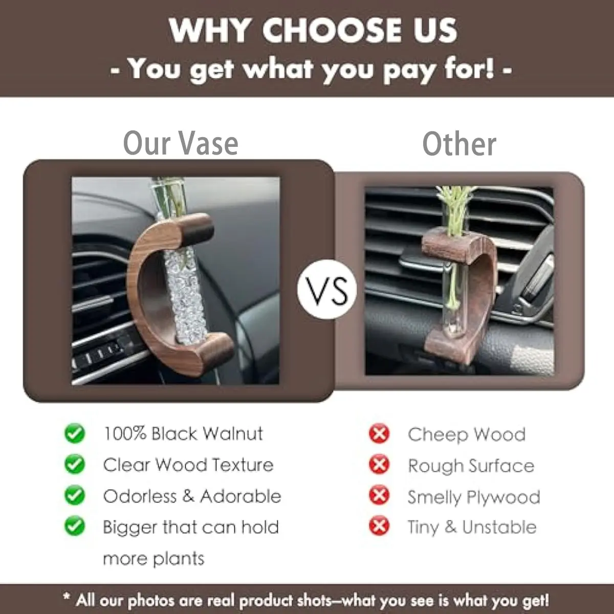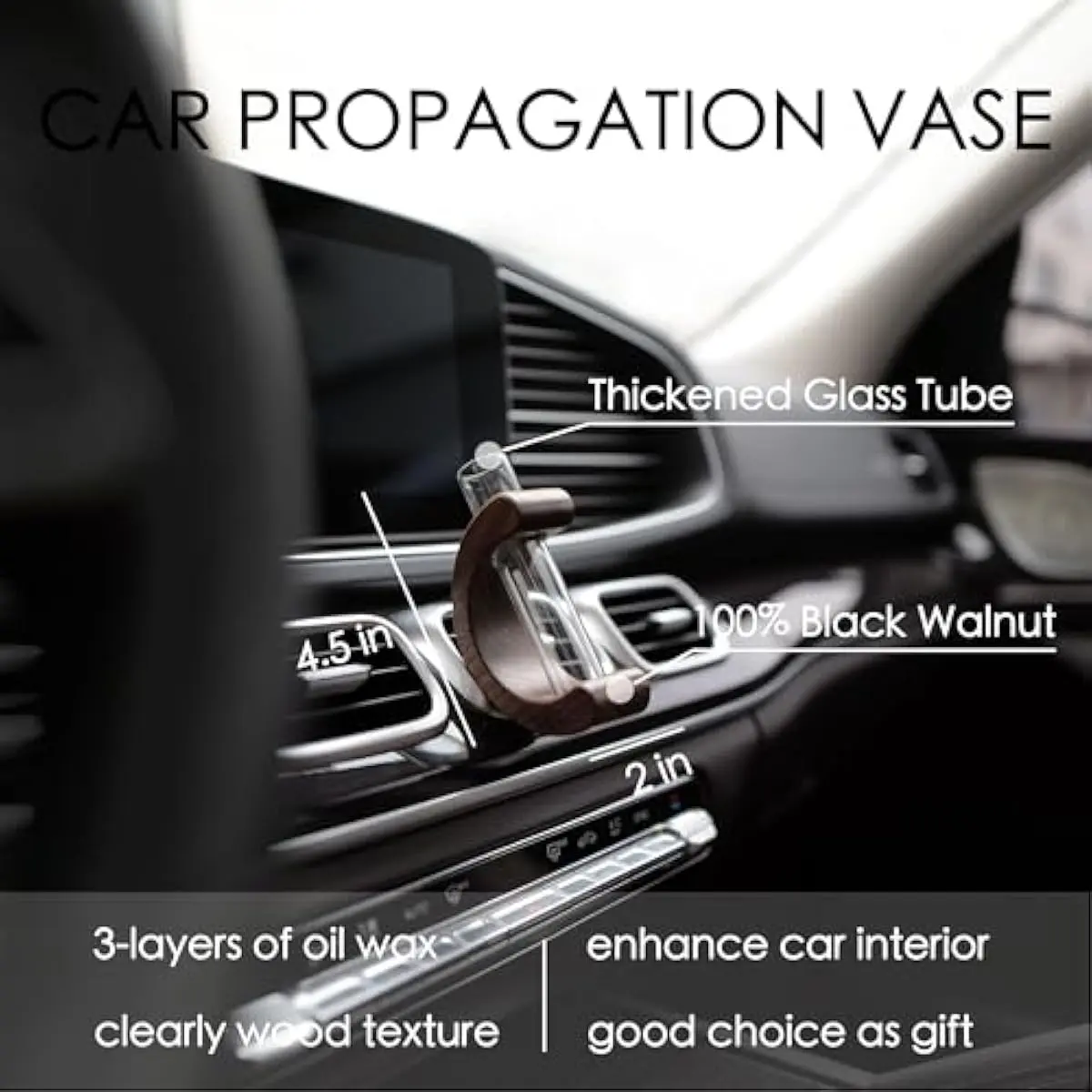 Elevate Your Car's Interior Aesthetics: Transform your cabin into a sanctuary of style. Featuring a minimalist and modern accent, the rich black walnut wood base adds warmth and sophistication, while the clear glass tube elegantly displays your botanical treasures for a touch of natural elegance