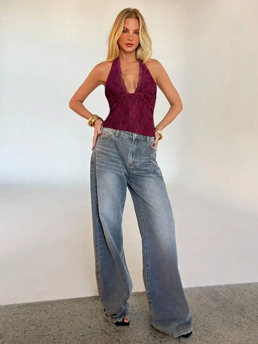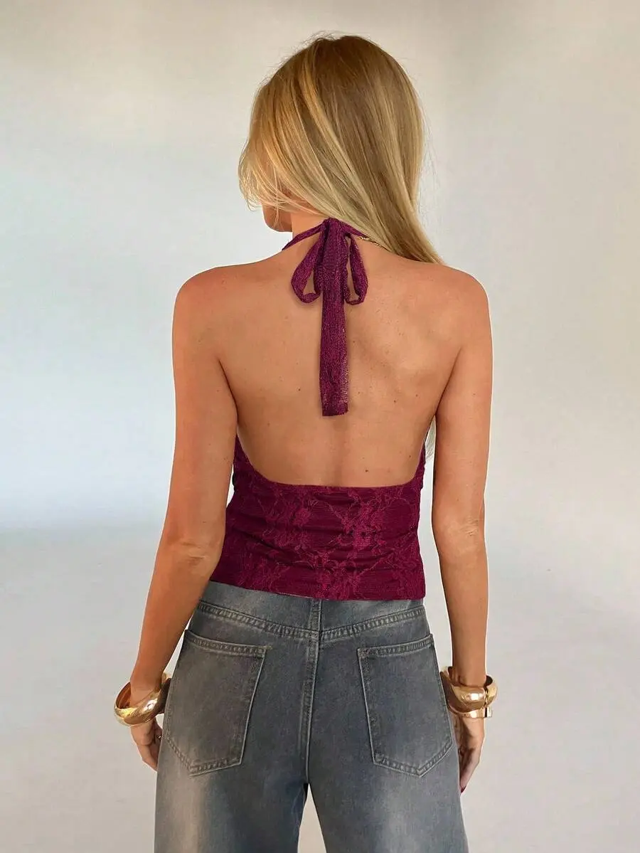 SOLEMN Fashionable Backless Lace Halter Neck Camisole For Women Burgundy Vest Ancora Casual