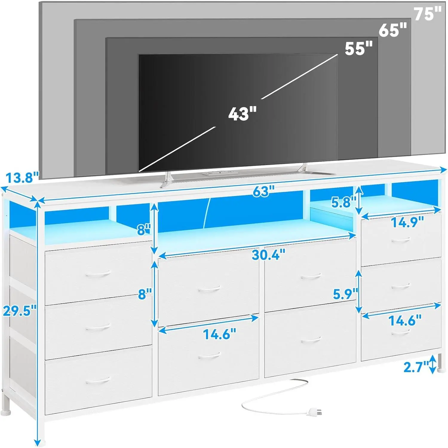Designed for modern living, this multi-functional 63-inch wide dresser TV stand is the ideal combination of style, storage, and practicality. It fits perfectly in entryways, hallways, bedrooms, living rooms, and closets, making it a versatile addition to your home furniture collection.