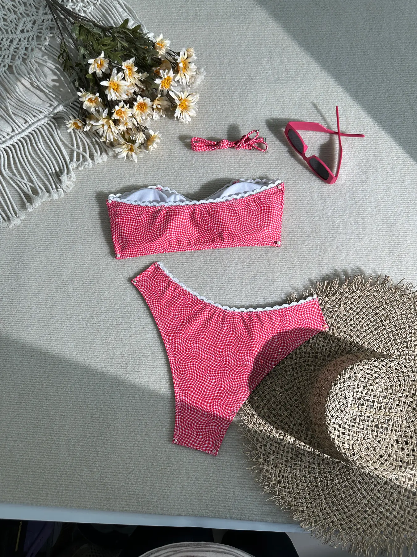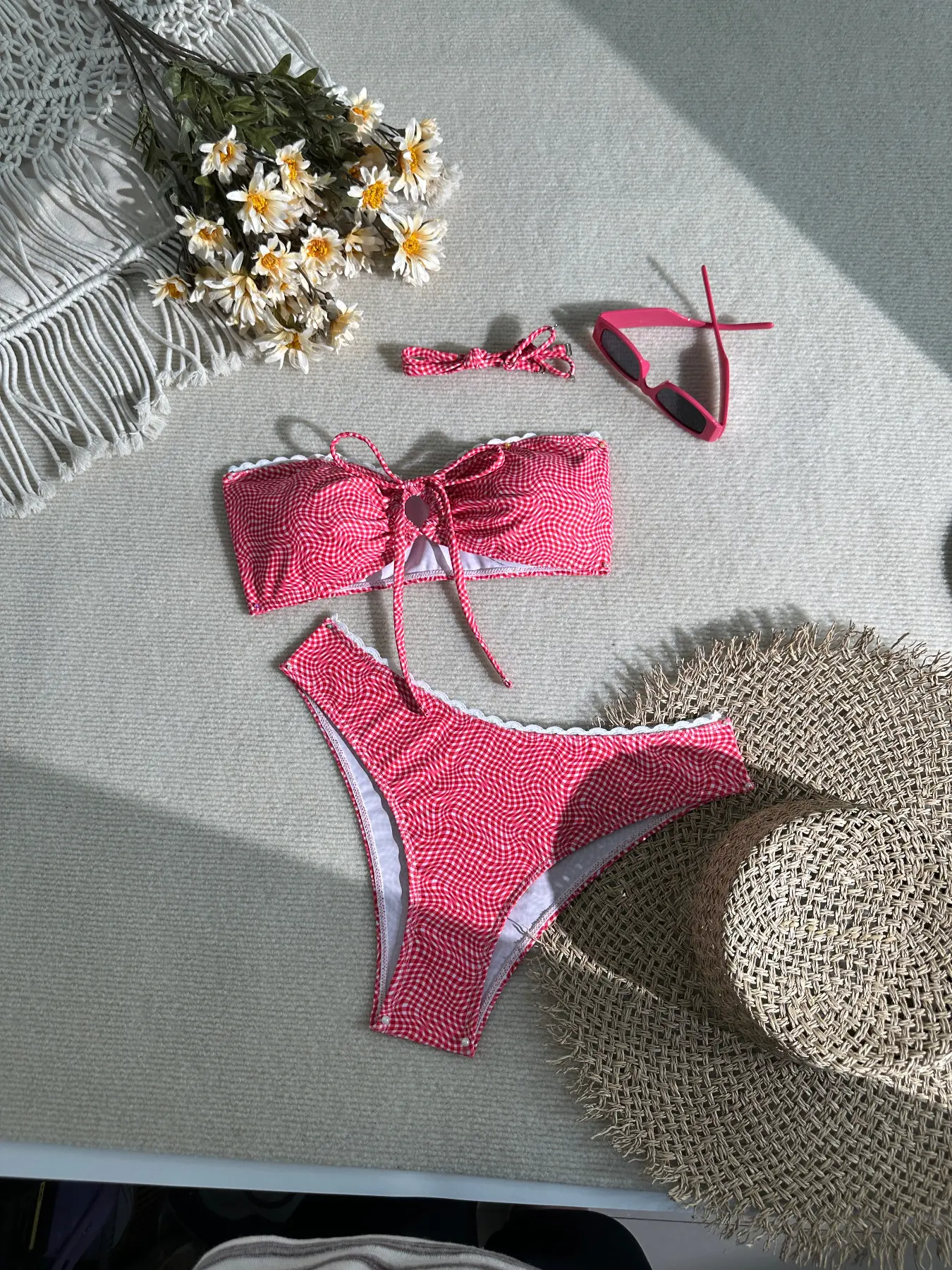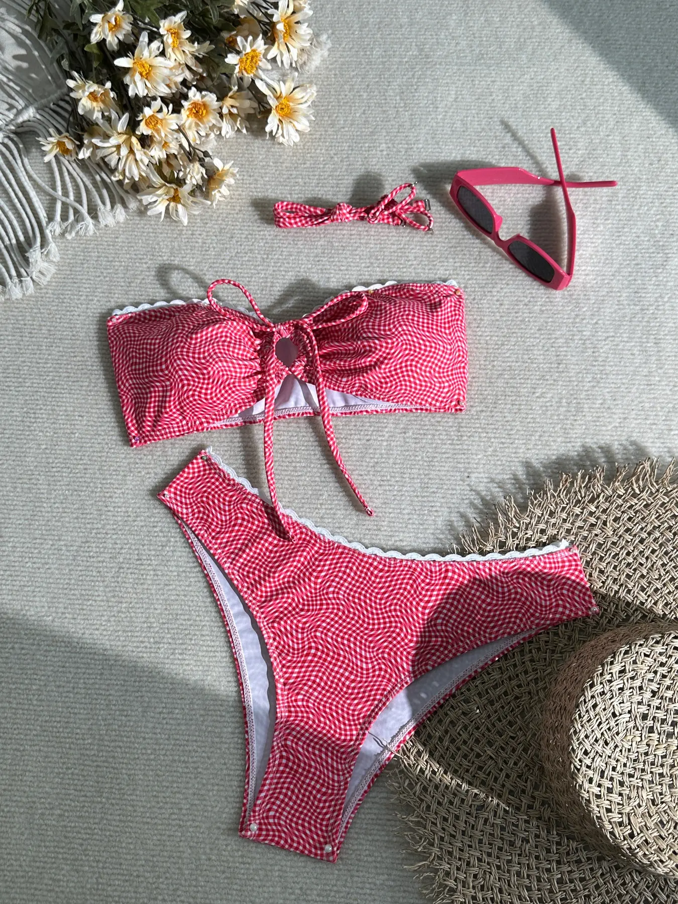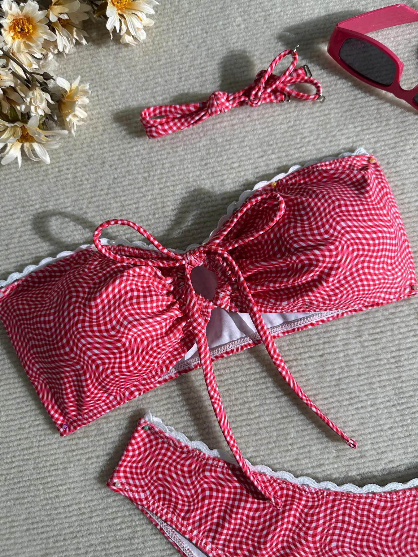 2026 New Retro Red Gingham Bandeau Bikini, Lace Trim Tie Front Convertible Strap Two Piece Swimsuit, High Cut Summer Beach Vacation Swimwear