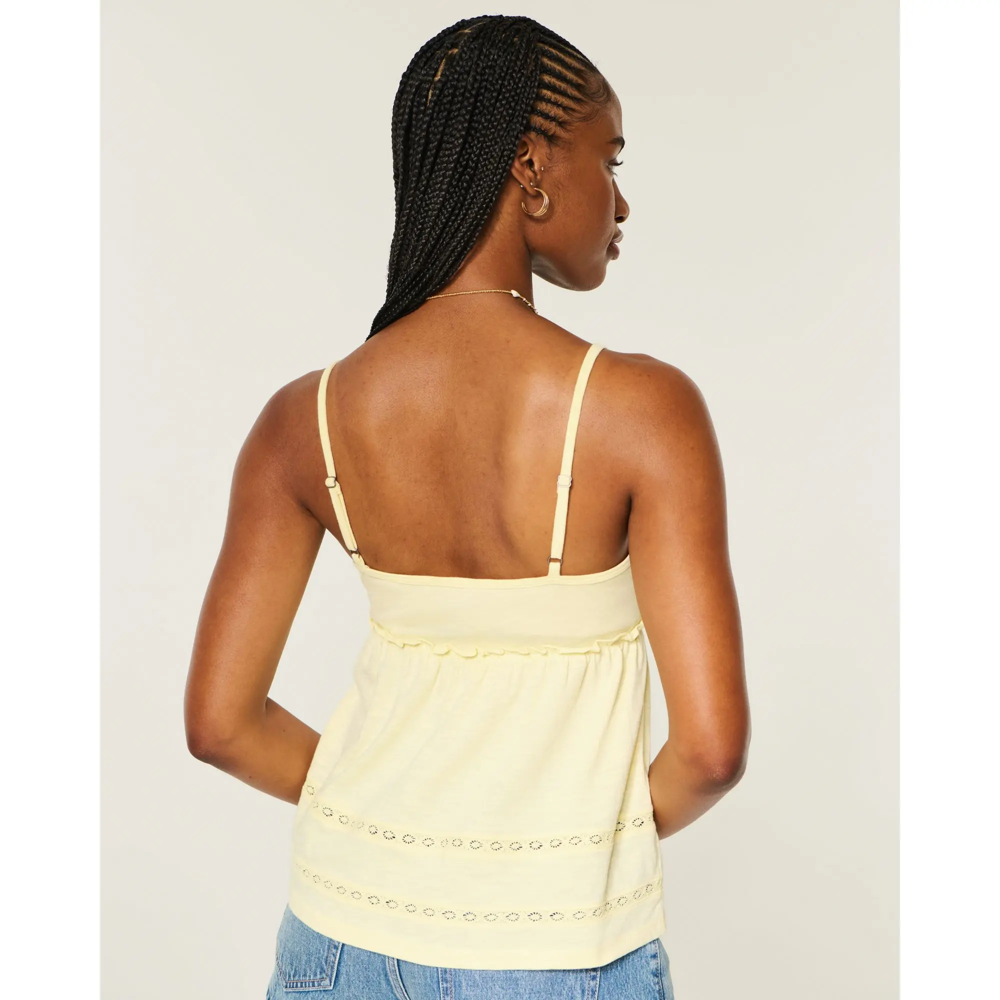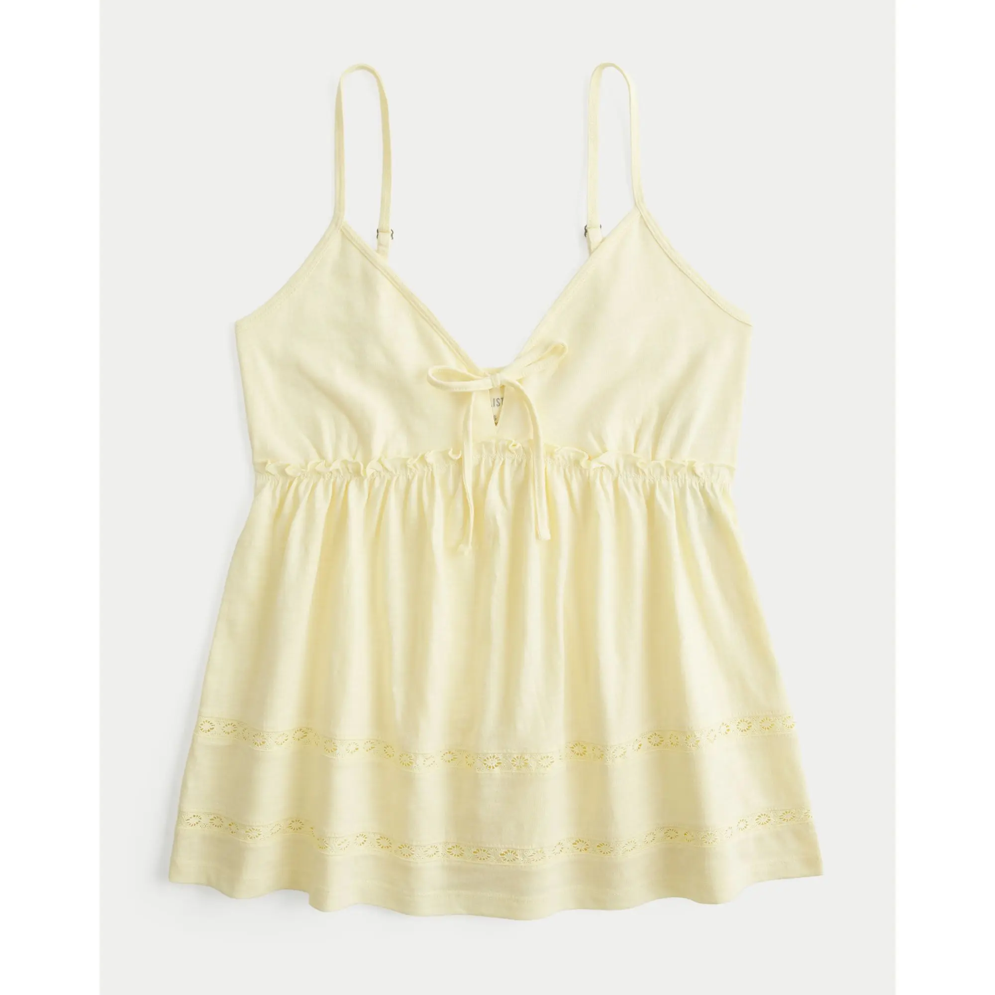 Flowy and super soft, this babydoll top features adjustable cami straps, tie front detail, lace insets at hem. Easy Fit. Imported.