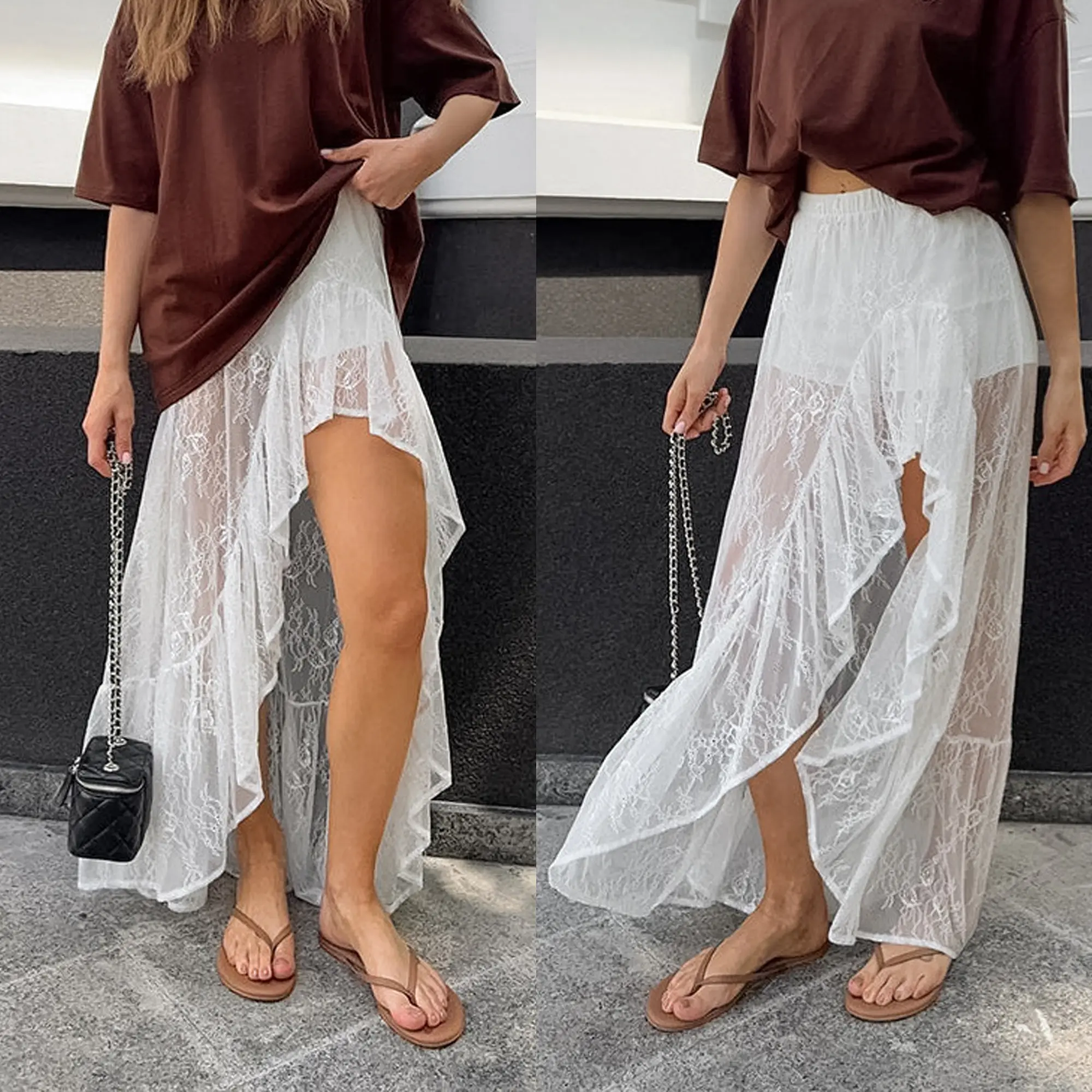 Woman's High Waist Lace Maxi Skirt, Breathable Lightweight Lace Fabric, Built-in Anti-slip Lining, Irregular High Slit, Ruffle Hem, Stretchy, Body Inclusive, Lengthen Legs, Sexy Romantic, Summer Comfort, Beach Vacation, Street Hangout, Date Dinner, Weekend Trip, Versatile Match