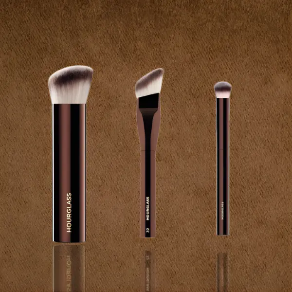 Achieve airbrushed, flawless skin with this essential Hourglass brush trio, designed for seamless foundation and finishing.