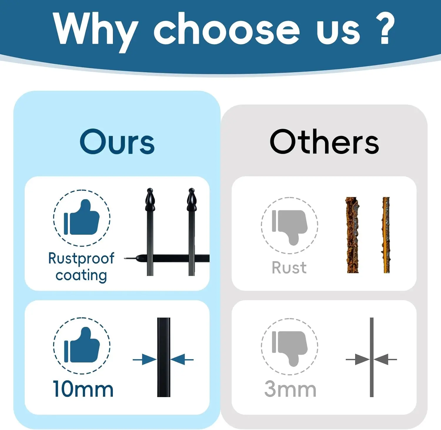 ·【Sturdy and Durable】This metal garden fence is made of 10mm diameter wrought iron welded together and covered with a black rust-resistant coating that won't rust easily. Compared to wood fences and plastic fences, it requires no frequent maintenance, is fearless of insect bites and corrosion, effectively withstands harsh weather, and is durable.