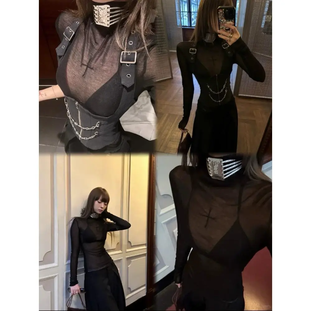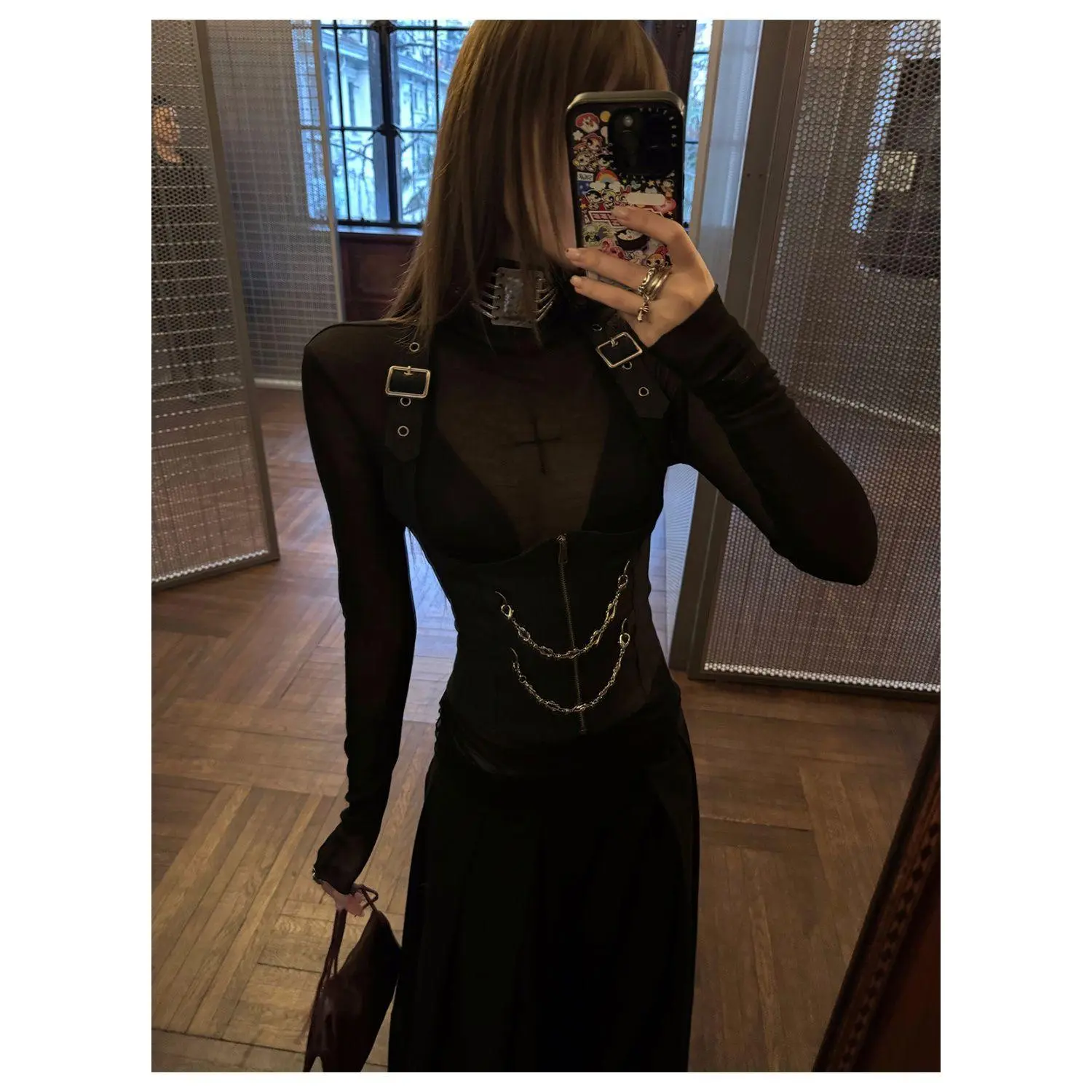 Autumn Gothic Spicy Girl Elegant Shirts Women Zipper Design Vest + Retro Harajuku Blouse Female Chic Korean Popular Clothes