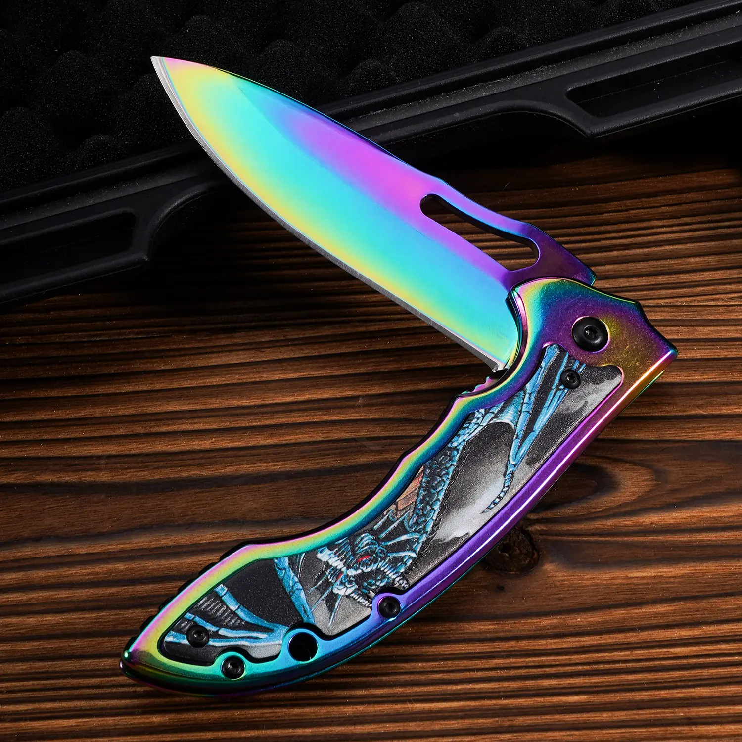 Portable EDC multifunctional tactical outdoor colorful folding knife and pocket knife. All-steel construction with a quick-opening design; outdoor cutting tool designed specifically for climbing and fishing; an essential item for camping and hiking.