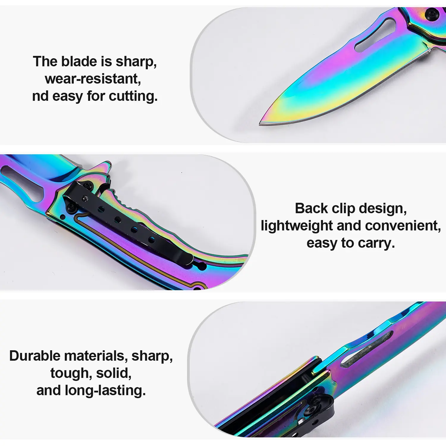 Portable EDC multifunctional tactical outdoor colorful folding knife and pocket knife. Fully steel construction with a quick-opening design; an outdoor cutting tool specifically designed for climbing and fishing; an essential item for camping and hiking.