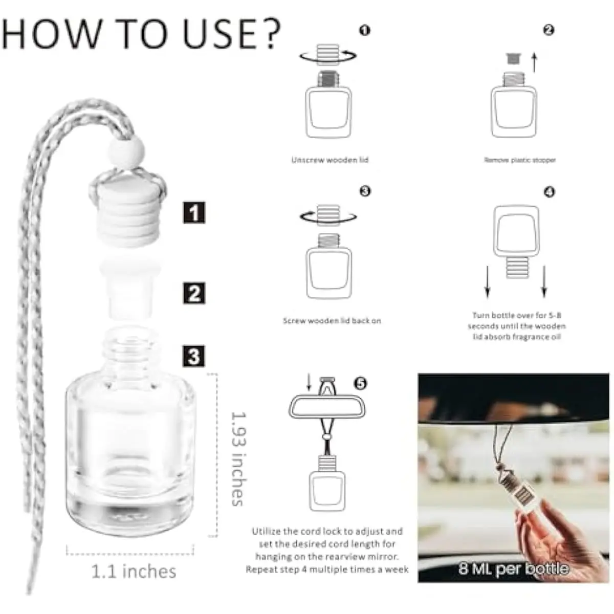 Easily InstalledThe hanging car air freshener glass bottle can store 8ml volume of perfume(two bottles of aroma lasts at least 90+ days). Car diffuser when using, just remove the safety helmet and invert the bottle for 10 seconds, let the fragrance soak through the bottle cap, and then use the attached rope to hang it from the rearview mirror, It will not hinder the line of sight but also enhance the delicacy of the car
