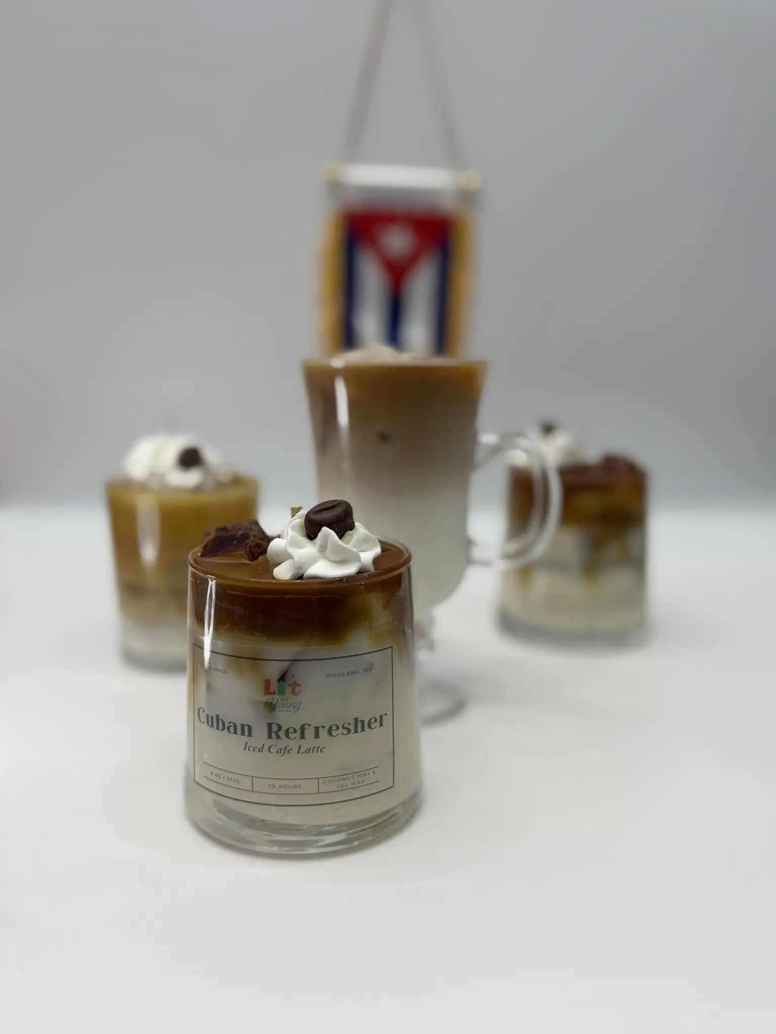 This handcrafted candle is designed to look like a refreshing iced latte, complete with layered “coffee” wax, ice cube details, and a whipped cream topping with a coffee bean accent.