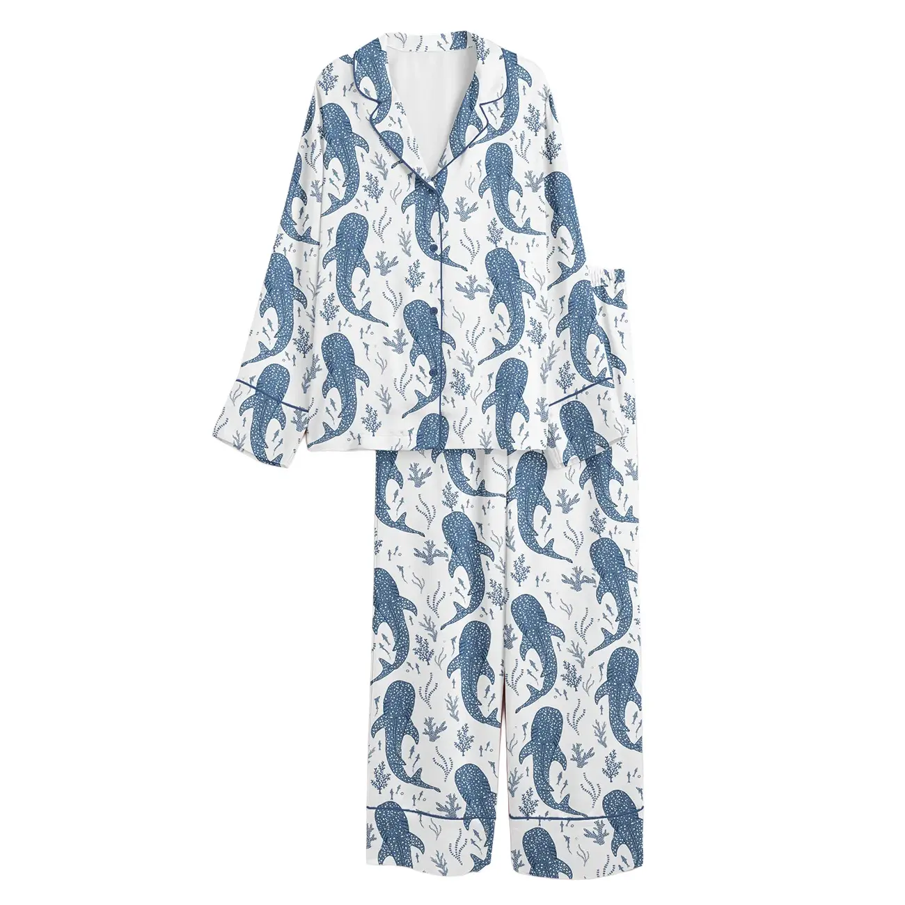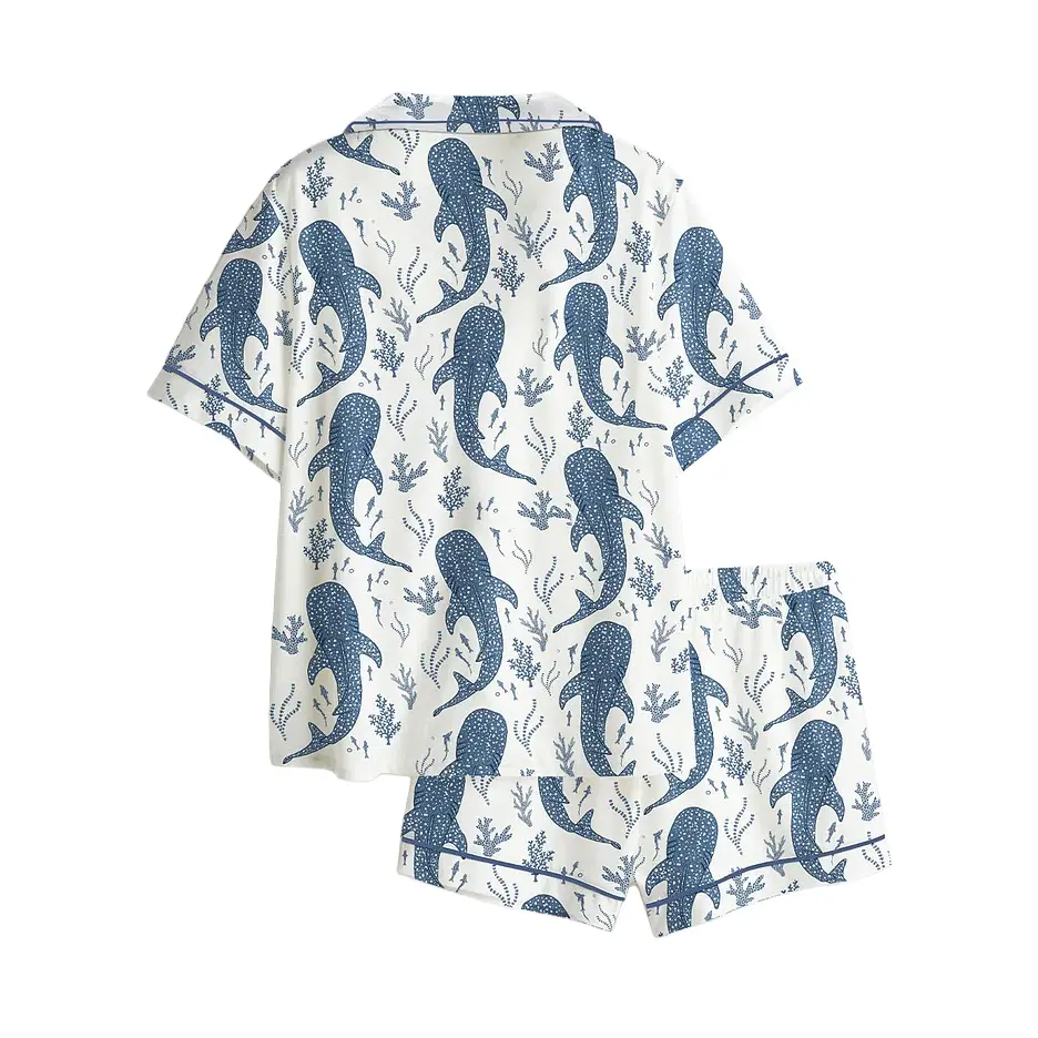 Women’s Whale Shark Beachy Long & Short Sleeve Satin Pajama Set, Gift for Her, Funny Lounge Outfit Gift, Loungewear Long & Short Set, Soft Sleeper Wearing