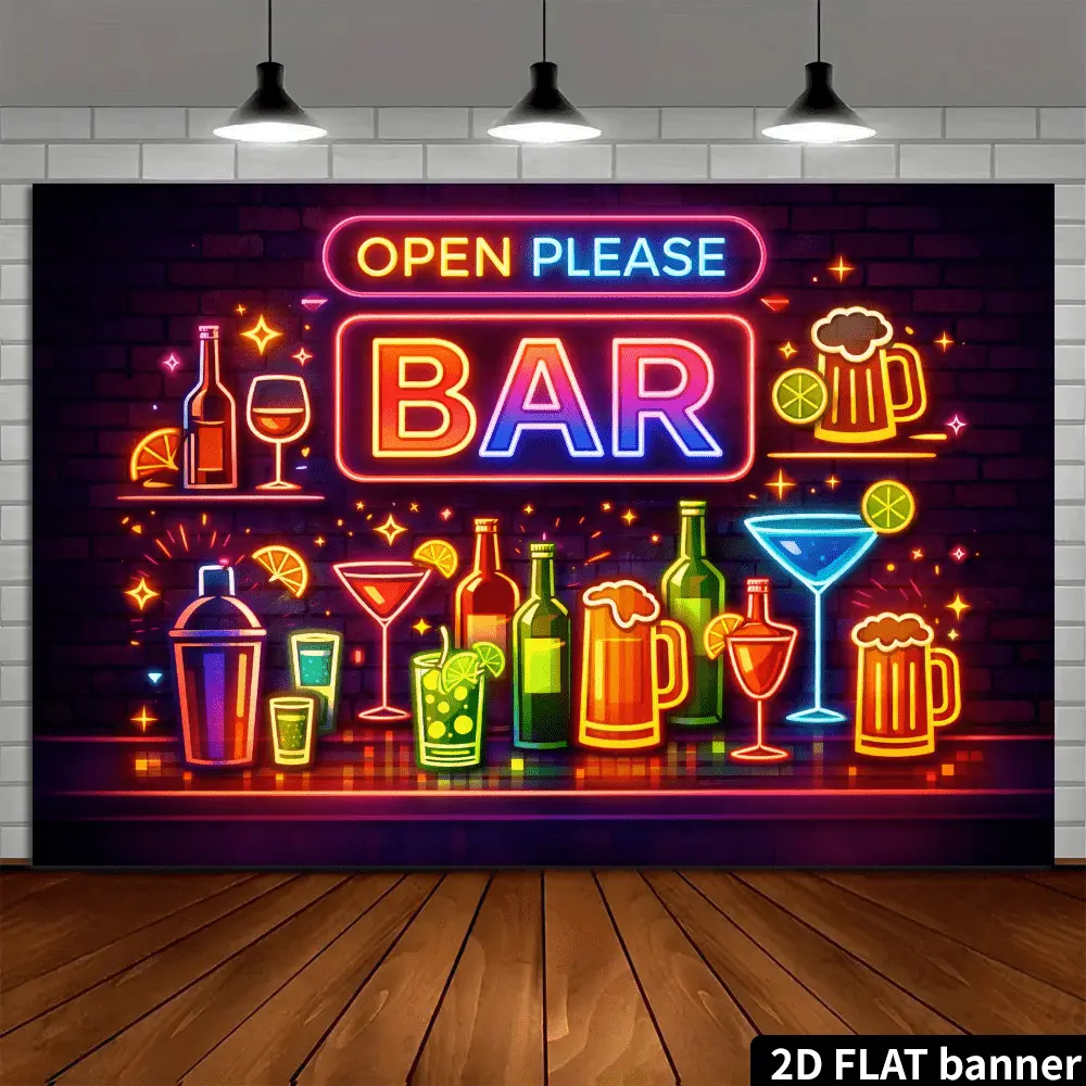2D Flat Neon Bar Themed Backdrop with "OPEN PLEASE BAR" Style, Featuring Bartender Tools, Beer Mugs, and Cocktail Elements. Made of Durable, No Power Supply Needed. Suitable for Bar Decor, Party Setup, and P