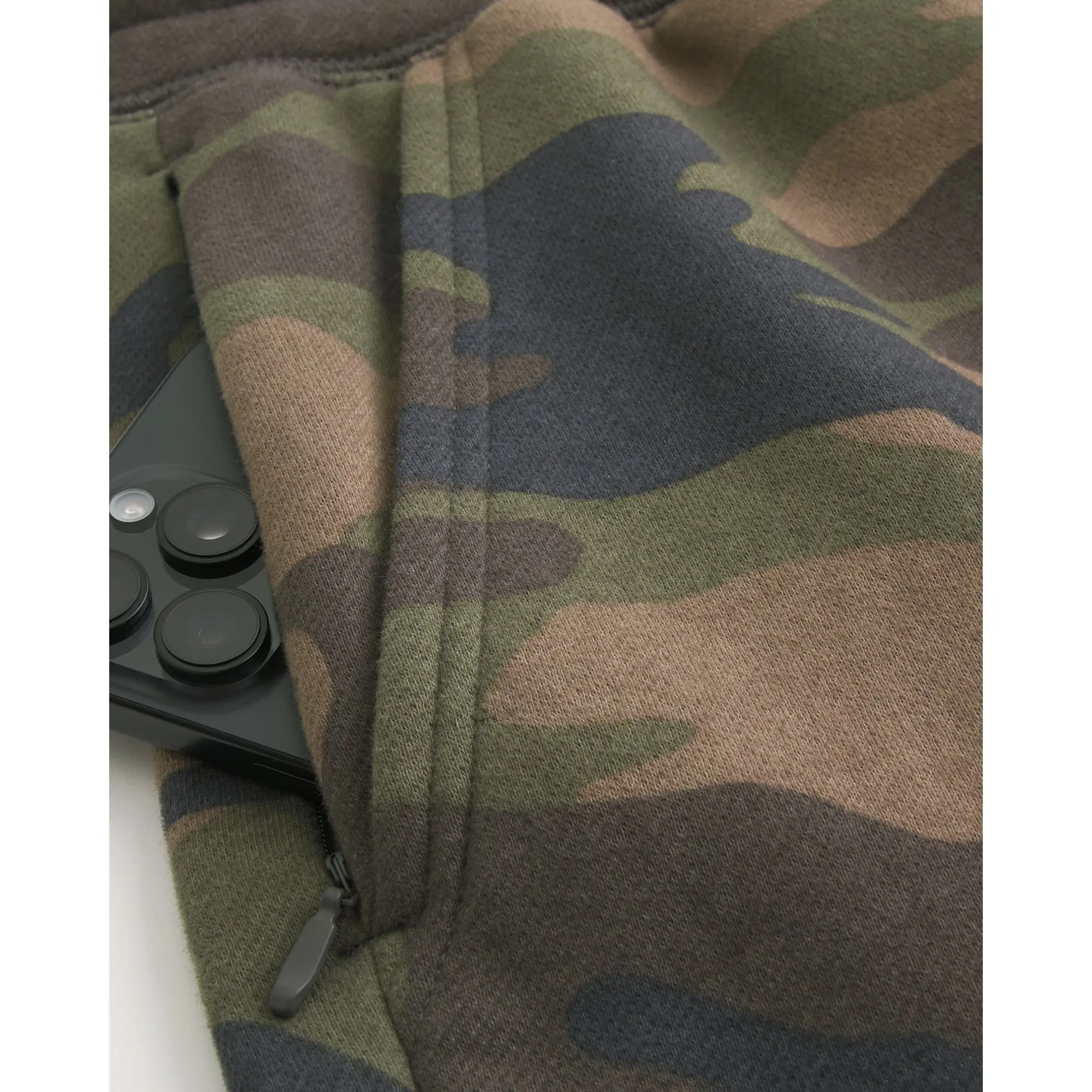 Super soft fleece shorts featuring an all-over camo pattern. Drawstring waist, at-the-knee length, baggy fit, pockets, right zipper pocket. Imported.