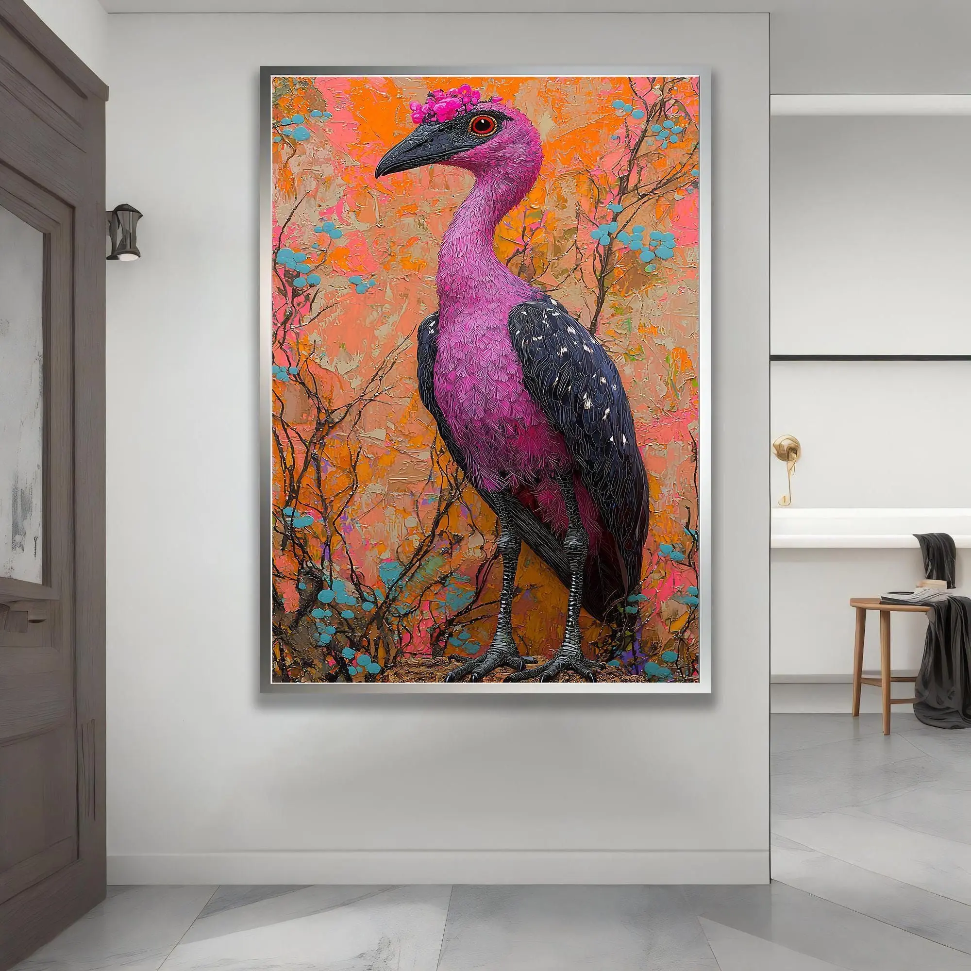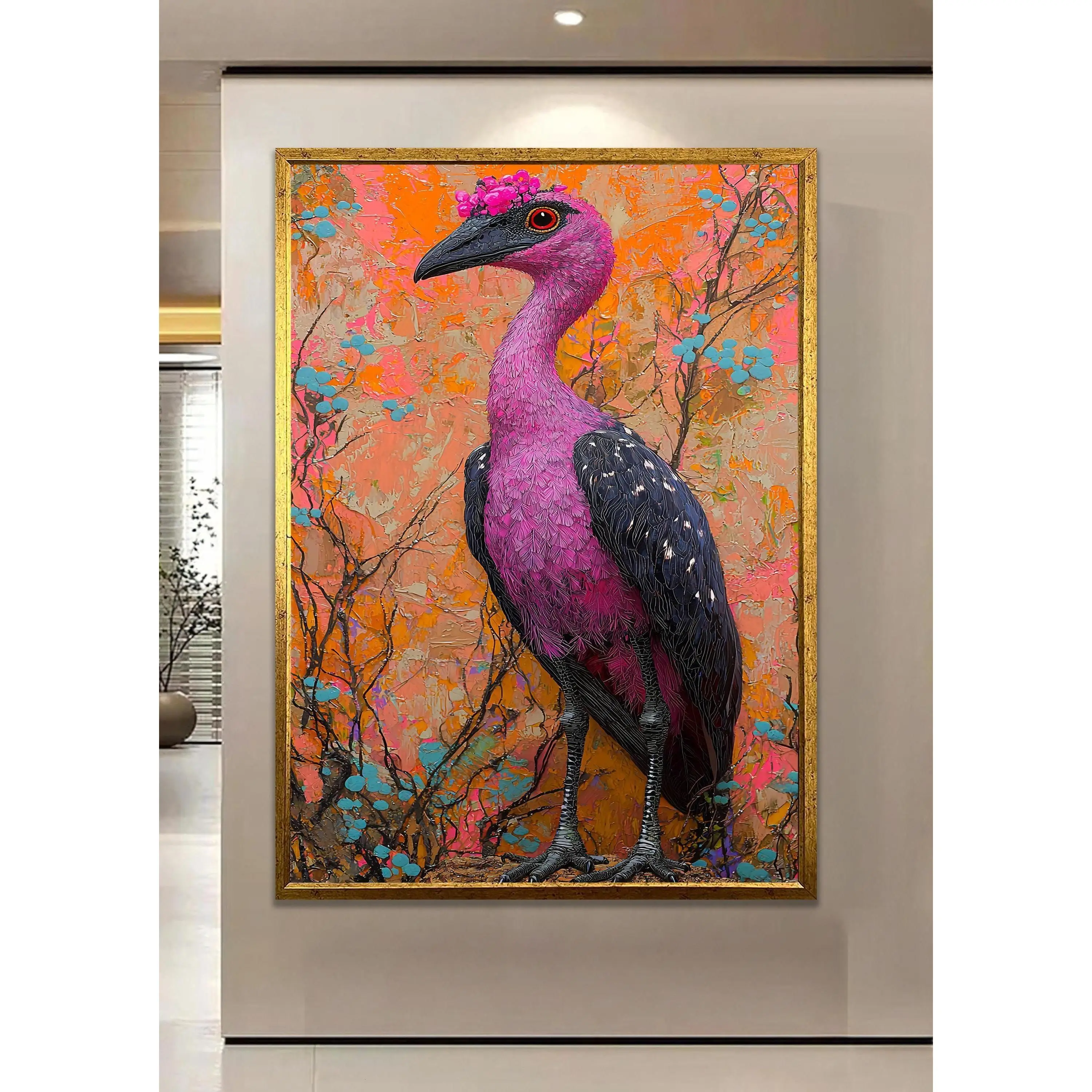 [Sale off up to 40%] [Frame Canvas] Pink Bird Canvas; Whimsical Crowned Bird - Bright Floral Design, Durable Kiln-Dried Frame, Ready to Hang Wall Art