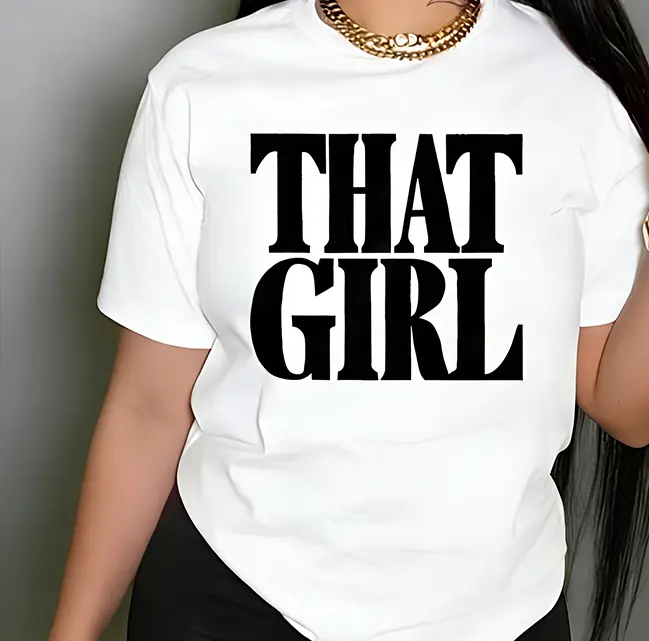 This women’s casual T-shirt showcases a striking "THAT" graphic with bold geometric lettering. The design is clean, minimalist, and fashion-forward, making it easy to match. It's perfect for expressing confident personal style. The simple yet strong statement design adds a modern touch to any outfit.