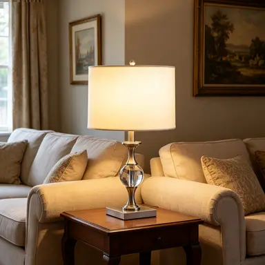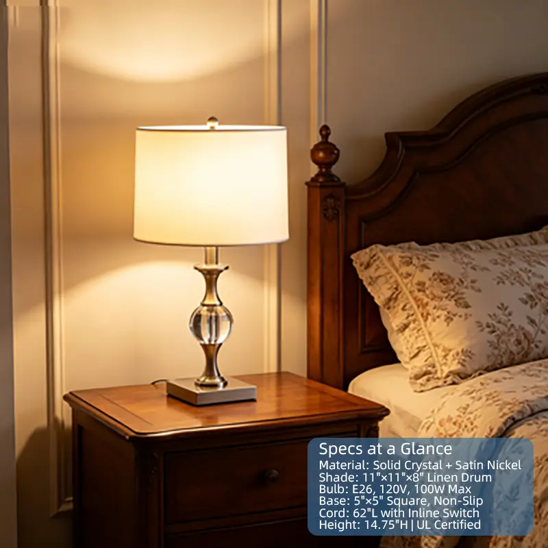 Core Specifications (Clear & Intuitive) - Overall Height: 19.75" - Material: 100% Imported Solid Crystal, Silver Satin Nickel Metal Fixture - Lampshade: Uno Fitter White Cotton/Linen Drum Shade, 11"L x 11"W x 8"H - Base: Silver Satin Nickel Square Base with Black Rubber Cover, 5"L x 5"W x 1"H - Bulb Requirement: 120V 100W Max Type A (E26), compatible with incandescent/CFL/LED (Not Included) - Switch: Inline Clear On/Off Switch (On Black Cord) - Distance from Base to Inline Switch: 10"L - Power Cord: Black, 62"L - Distance from Bulb Socket to Table Base: 5"L x 5"W x 14.75"H - Certification: UL Certified (E521276)