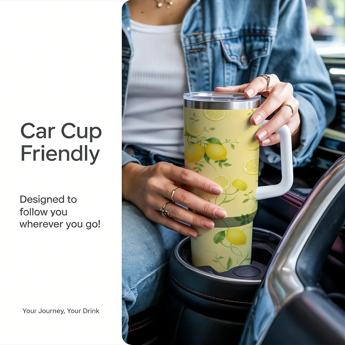 30 oz Zesty Lemon Insulated Tumbler, Sunny Yellow Travel Mug with Vintage Citrus Fruit Print, Comfort Handle & Straw, Summer Vibe Aesthetic Water Bottle, Perfect Gift for Sun Seekers