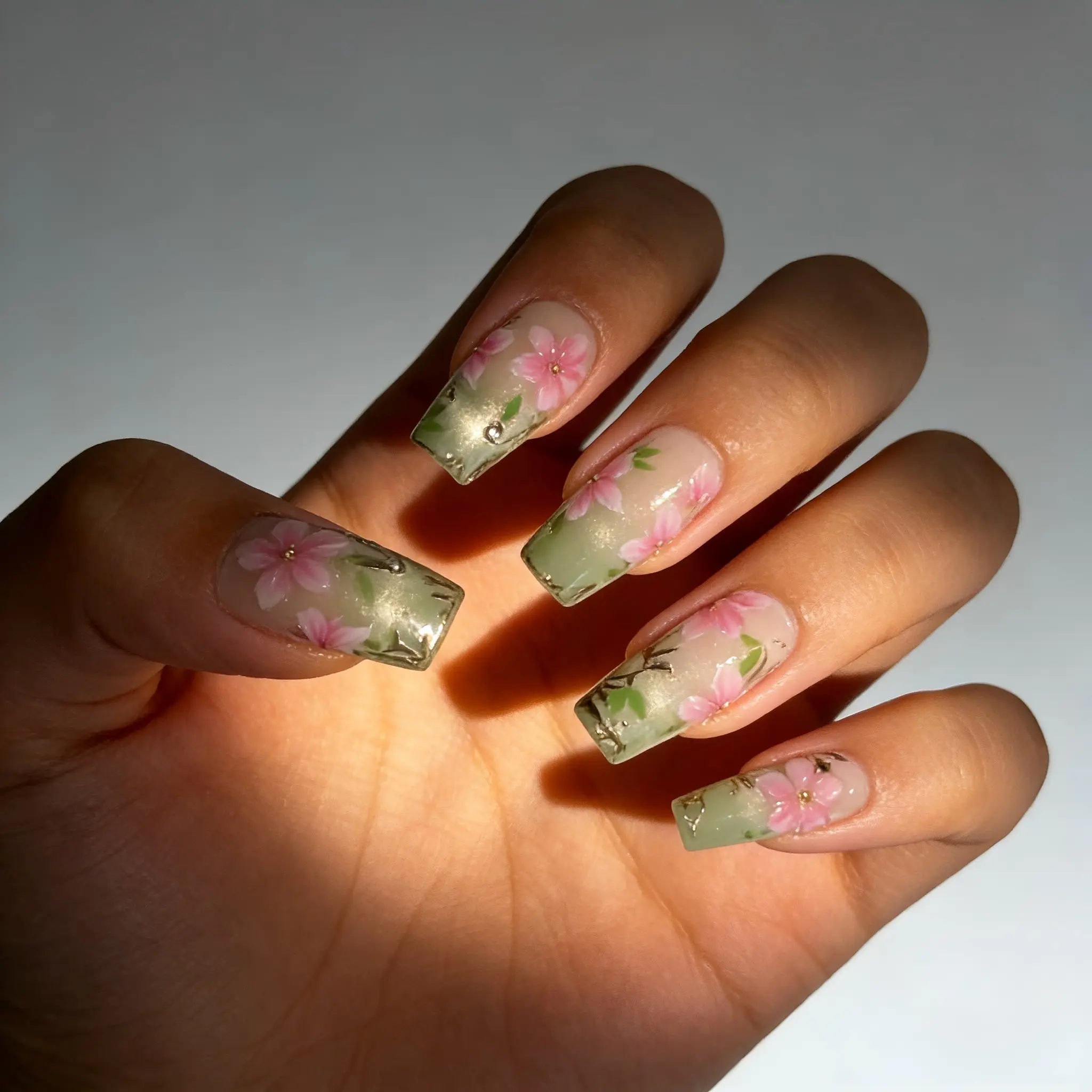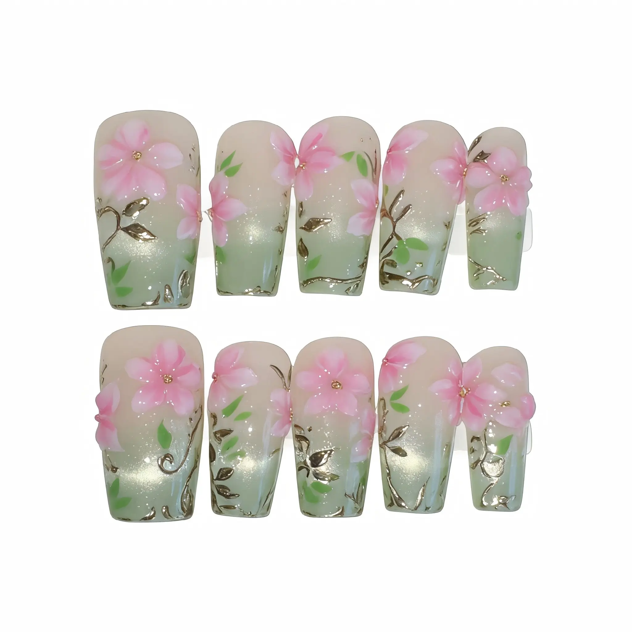 Step into spring with these exquisitely delicate handmade floral nails! Each set is meticulously handcrafted, featuring stunning 3D pink cherry blossoms and intricate green leaf details, all set against a soft, translucent green base. The long coffin shape adds a touch of elegance and glamour, perfect for weddings, proms, or any special occasion where you want to feel like a princess.