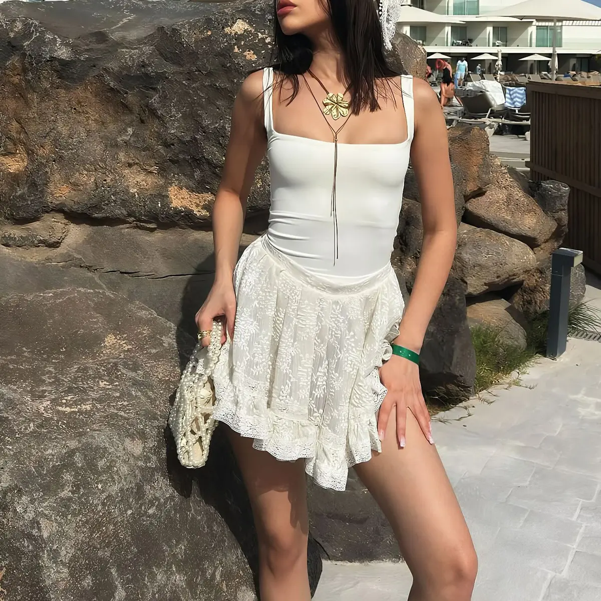 Woman's Summer High Waist Breathable Hollow Out Lace Mini Skirt, Double Ruffle Hem Lined Anti-exposure Skin-friendly Skirt, Slimming Hide Hip Fat For Daily Street Beach Vacation Party Date Campus Trip, Match Crop Top Sweet Casual Short Skirt