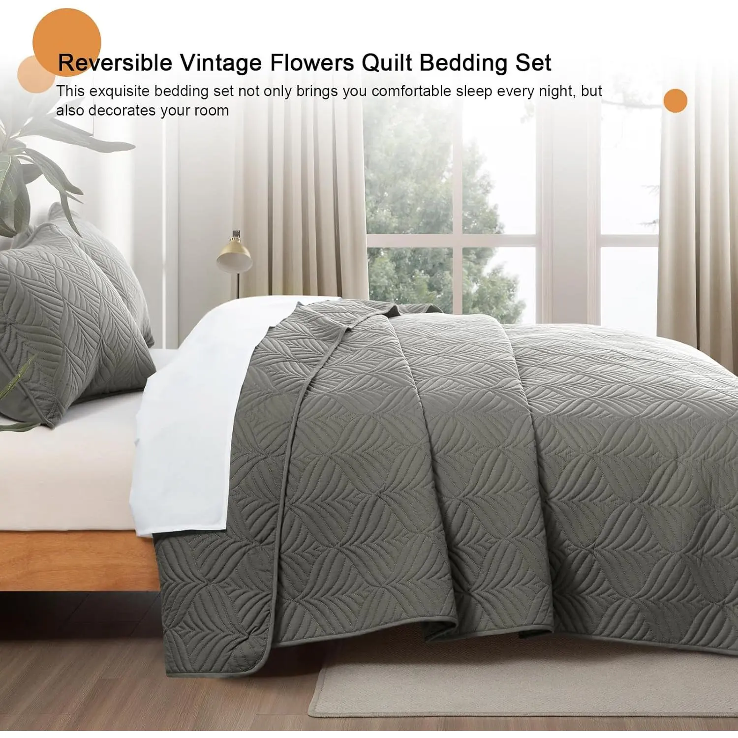 Soft Full Queen Bedding Set, Lightweight Grey Bedspreads Queen Size with Pattern, Reversible 3-Piece Coverlet with 2 Pillow Shames for All