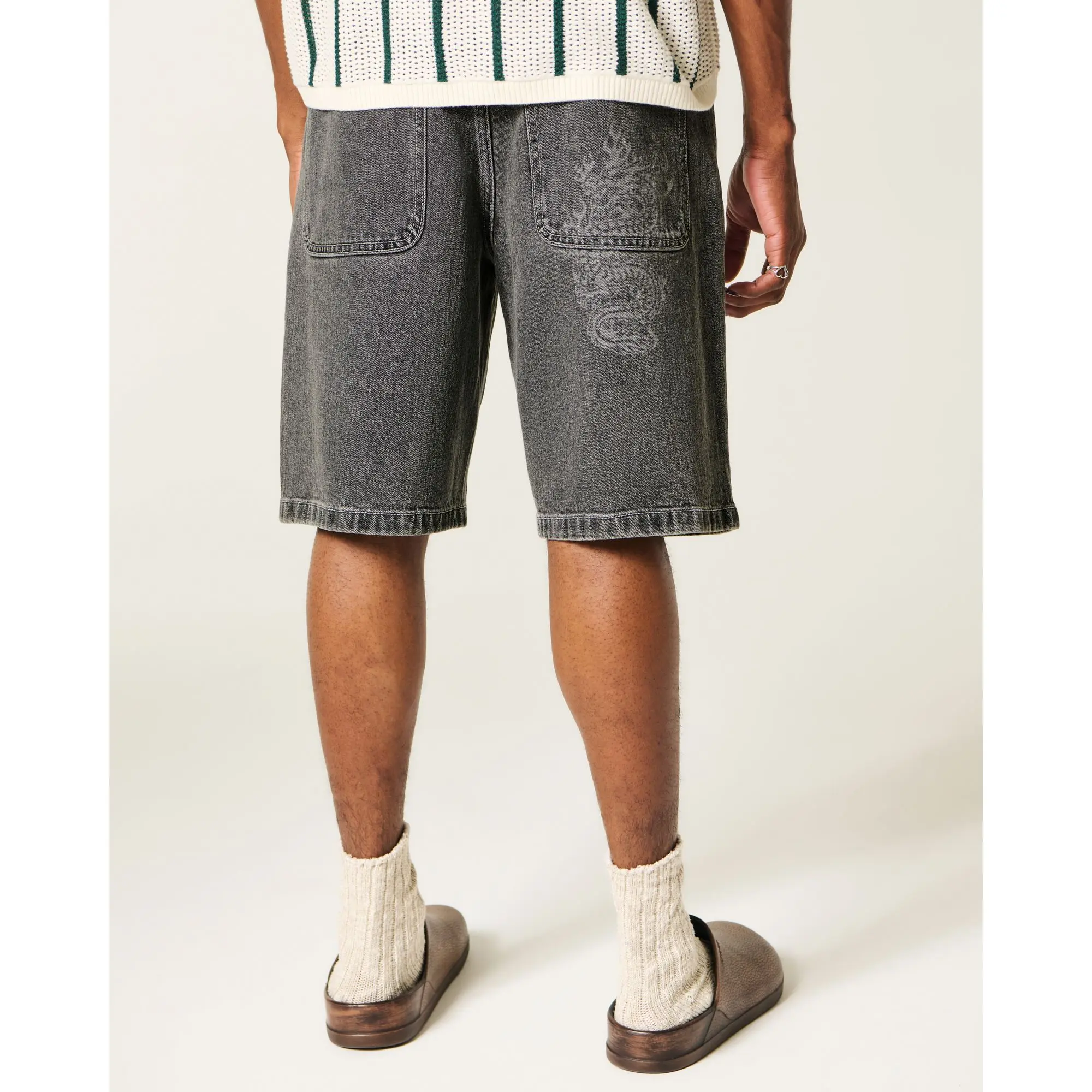 Classic denim shorts featuring a dragon graphic at the back pocket. Baggy fit. Imported.
